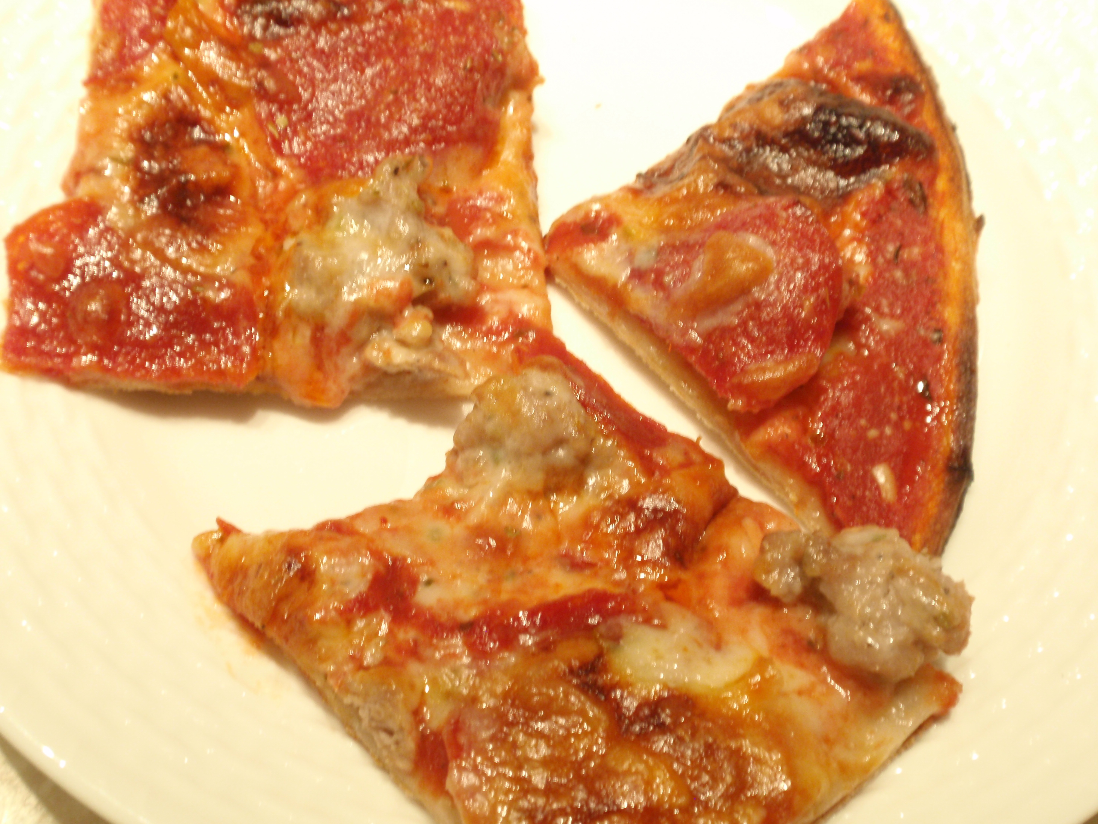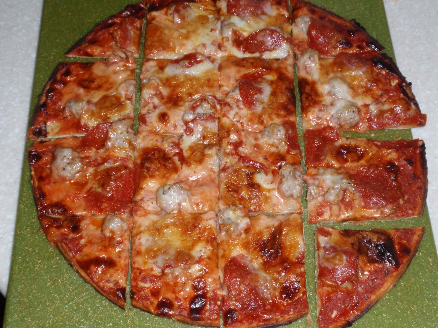 This is easy but the first time I did it I screwed it up.  I guess I have been foolishly cutting other pizzas into triangle for years and forgot how to cut a square slice. If you plan to cut your Imo’s into triangles, please stop reading now and go away.  To get a perfect cut simply cut the pizza in half and then cut each half in half again.  Then rotate the pizza 90 degrees and repeat.  You will have sixteen pieces, four insides, eight outsides, and four corners, which are my favorite.