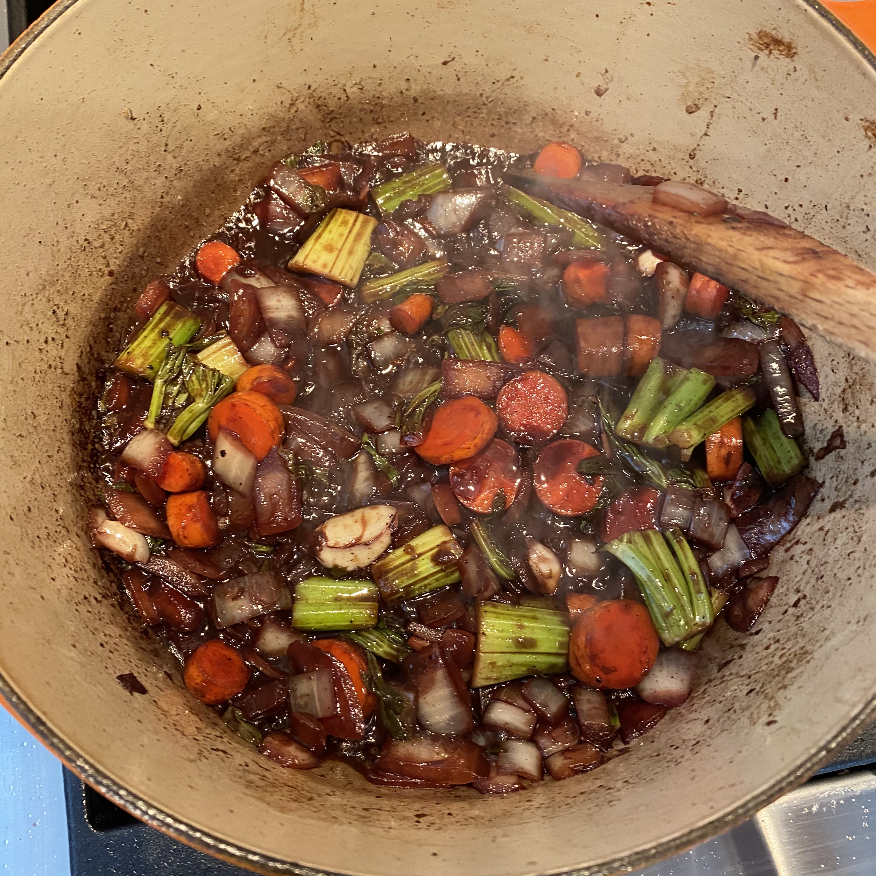Many recipes say that browning the meat is optional. This is as true as saying salt is optional. You don’t have to brown the meat, but it certainly won’t be as good. The amount of flavor it imparts in just a little effort means you absolutely should not skip browning. Onion, carrot, and celery provide the flavor base for the gravy. They are chopped and sautéed, along with some garlic. Once they have cooked down a bit, a cup of red wine is added and cooked away. Finally, the meat is returned to the pot; thyme, rosemary, and bay leaf is added; and all is drenched with beef stock. It is brought to a boil and then covered and kept at a simmer for four hours with the eating vegetables (We are choosing green beans, carrots, and pearl onions.) added for the final hour.