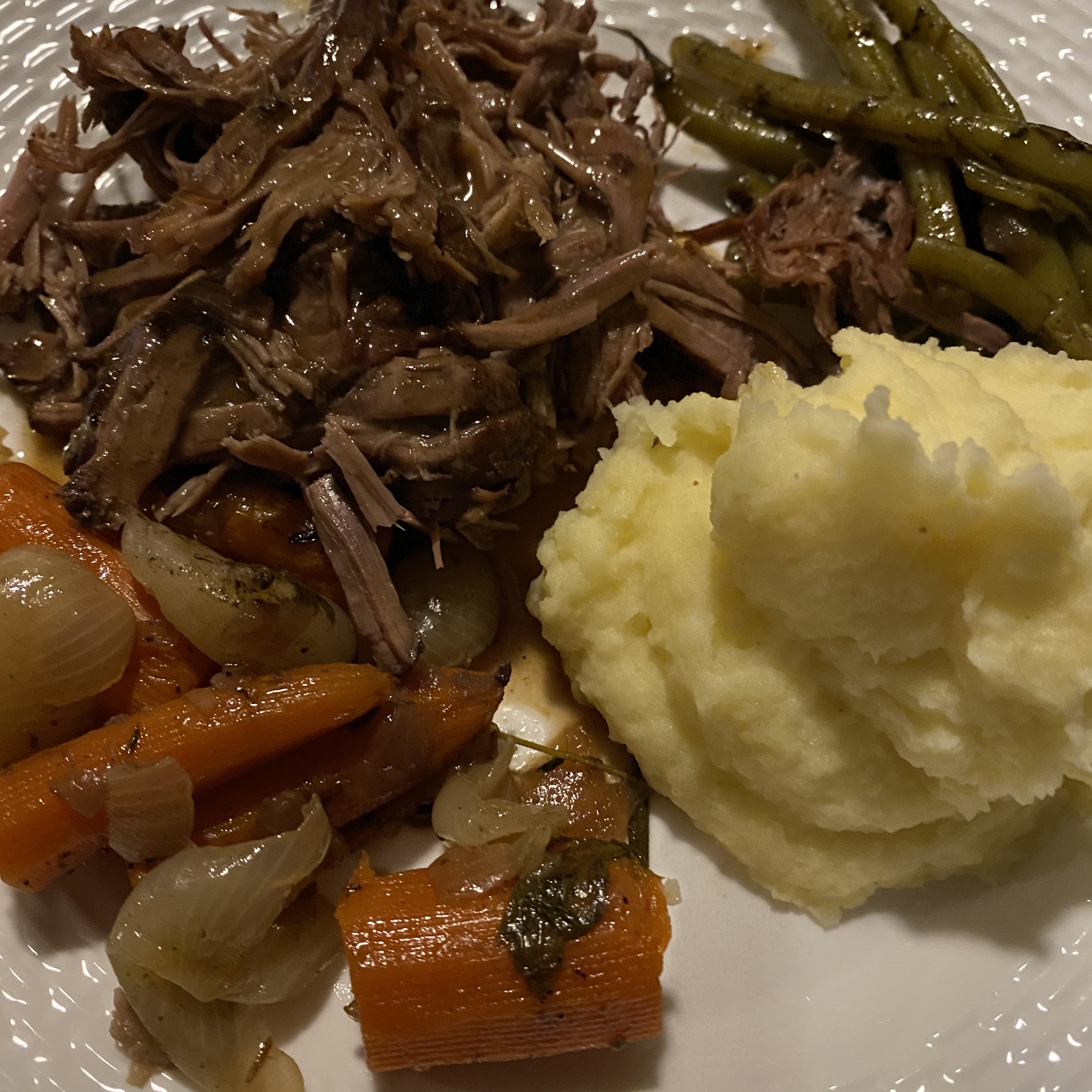 Pot roast is best served with vegetables, but the mistake some cooks make is that they add the vegetables to the pot roast too early. This leads to mushy, unpleasant vegetables. This can be improved upon by using two groups of vegetables, cooking vegetables and eating vegetables. The cooking vegetables are cut small and added at the beginning, flavoring the roast and the gravy. The eating vegetables are added near the end and cooked gently. Potatoes are a traditional pot roast vegetable, but rather than boiling them with the roast, we make a separate batch of mashed potatoes. If you prefer boiled potatoes just add them when you add the rest of the vegetables.