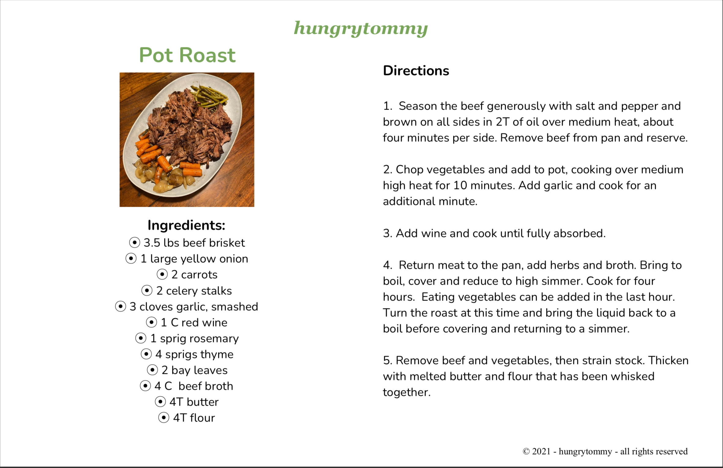 At this point, the meat should be incredibly tender. Plate it along with the eating vegetables and strain the gravy. We like to thicken the gravy with flour and butter, making it richer as well. The end result is a delicious meal fit for a cold winter’s day and the knowledge that you have some remarkable leftovers waiting for you if the snow doesn’t let up.