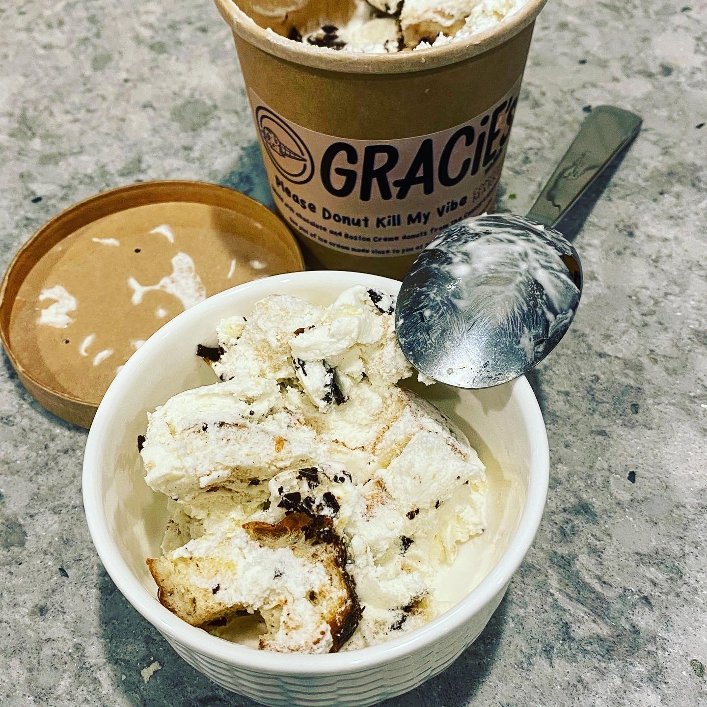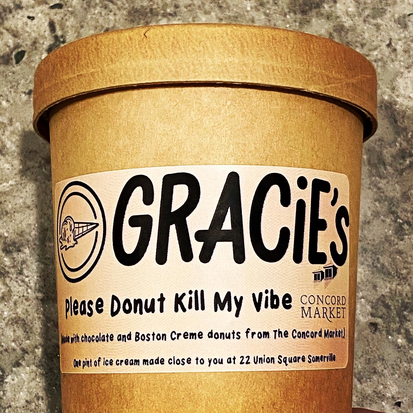 I know what you are thinking, but no such combination exists. Oh it does, it does. Head over to Concord Market and pick up a pint of Gracie’s “Please Donut Kill My Vibe.” It’s vanilla ice cream mixed with chocolate and Boston creme donuts from Concord Market. If you didn’t already know, Concord Market sells donuts on Sundays with a weekly popup called “Dan’s Donut Domingo.” And Gracie’s is a small batch, local ice creamery, located in Union Square in Somerville, MA. They are known for their creative flavors. Beyond the one we are taking about here, they have things like, Grapefruit Black Pepper Sorbet and Twinkies and Jam.