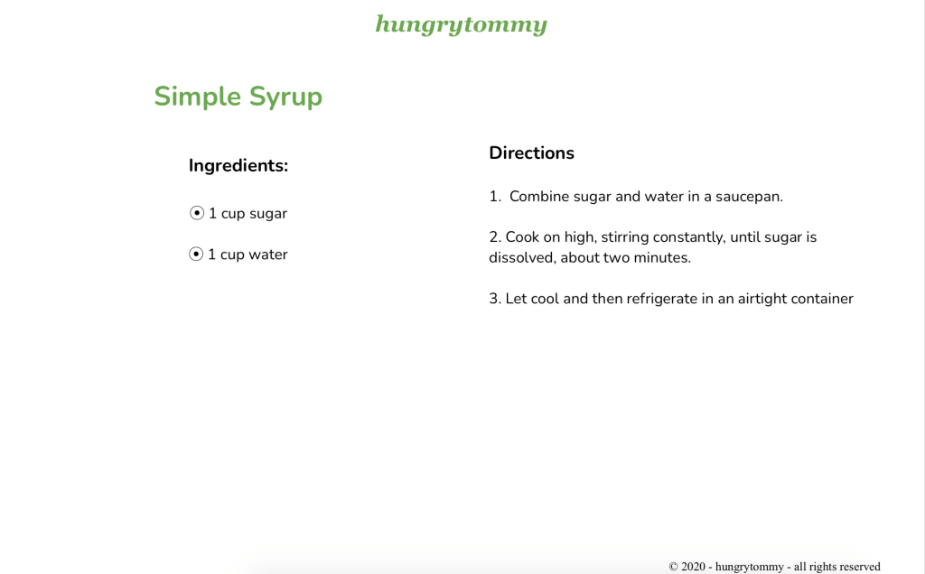 Simple syrup is sugar dissolved into an equal part of water. Many drinks, particularly some amazing cocktails, require simple syrup. It is also used in the kitchen in baked goods and salad dressings. After you have mastered basic simple syrup, which you will making it just once, you can move to the next level and start making flavored simple syrups. While it is possible to buy simple syrup at the store, I beg you not to. It is so cheap and easy to make that you really shouldn’t.