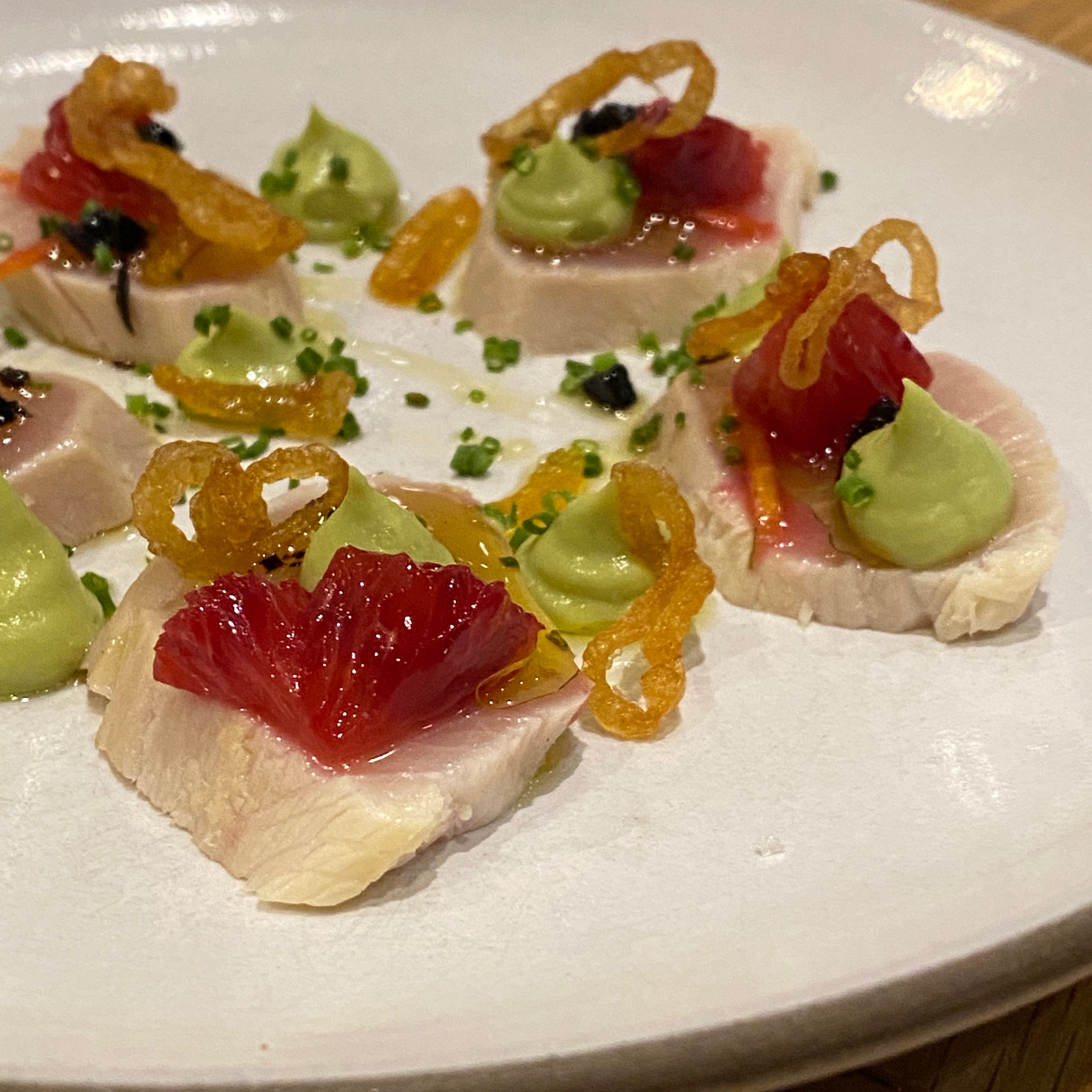 The restaurant is located in the Innovation and Design Building in the Seaport and has its own free parking lot which is a luxury in Boston. Currently there are six tables in the main dining room and others in the hall and on the patio. Spaces never look quite right these days, but despite the distance between tables, I liked the style of the room. The wine list was tight but creative, as was the cocktail list. I particularly enjoyed the grapefruit-rosemary spritz. This gin based cocktail balances citrus and herbaceousness, a great start to a meal and a good pairing for the hamachi crudo topped with blood orange and avocado mousse.
