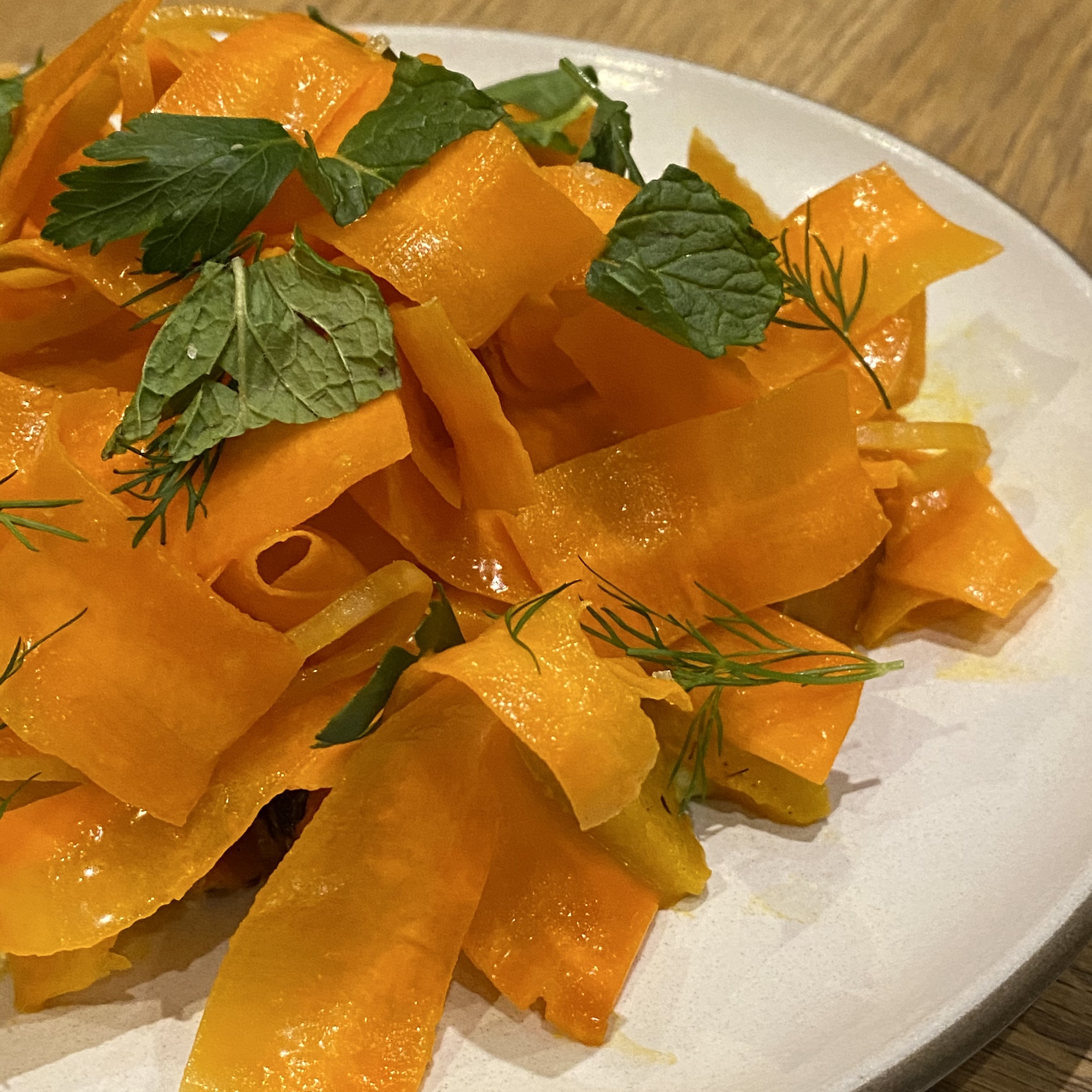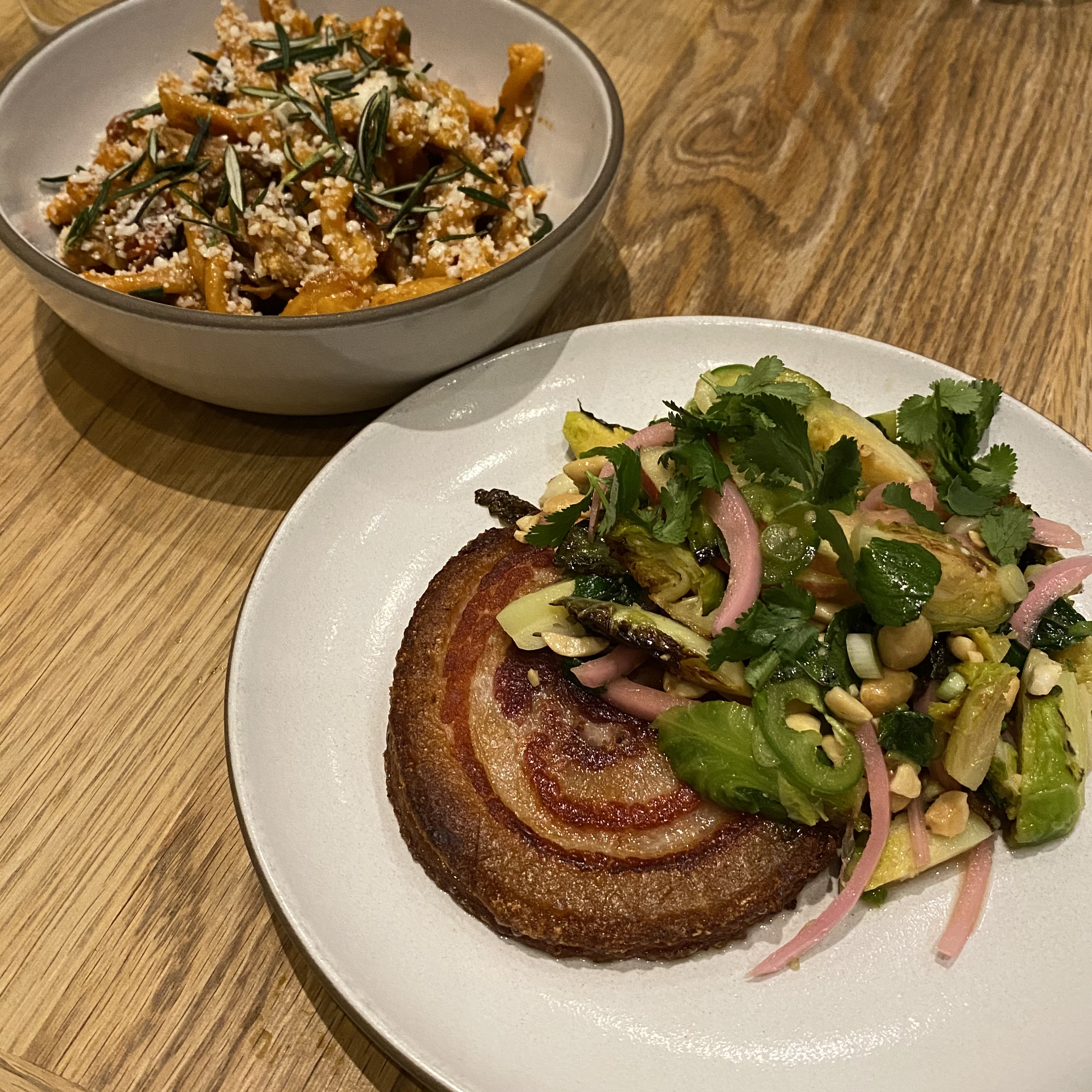 Creative and craveable, every dish was delicious. The cold carrot salad combined shaved carrots and chunks of carrots with an avocado hummus. It was seasoned with cumin and should not be missed. The steak tartare was a unique and exceptional expression of the dish. When served the tender beef was hidden under truffle mousse and fried sunchoke. It’s up to you to spoon it on to flavorful seed crackers, of which seconds were needed and provided. The lamb pasta was more straight forward, but the large chunks of lamb and generous amount of fresh rosemary made it excellent. The porchetta blew me away. The fatty meat mellowed by the sharp brussels, spicy chilis, and sweet apples blended for one of the most magnificent dishes I’ve enjoyed since the world shut down.