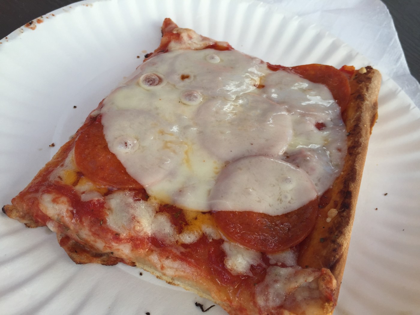For my taste test I went a step further and got peperoni as well. I started out by ordering a slice from each. Both added five slices laid out in the same pattern you find on dice. Being new to the system, I got one with extra cheese and one without. I didn’t mean to. I just didn’t say the right phrase when ordering, “extra peperoni, extra cheese.” This was clear at Tripoli where it is right on their menu so I got it right there and wrong at Cristy’s.