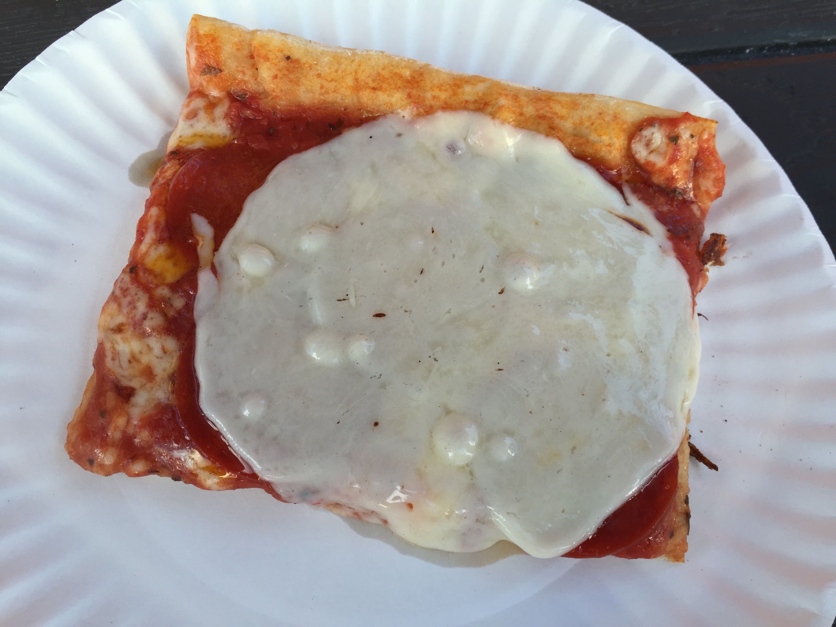 There is a lot in common between Cristy’s and Tripoli. They both are walk up stands serving “beach pizza,” a huge sheet pizza cooked in advance with sauce and cheese, cut into squares, and then topped and reheated when you order. You place your order and wait for them to heat it up and then carry it away, usually to nearby picnic tables to enjoy. The basic option is extra cheese. Both spots will put a slice of American or provolone on your square. Here there is no rivalry, the only correct answer it seems is provolone. Also, they both serve Mello Yello which tastes great with beach pizza.