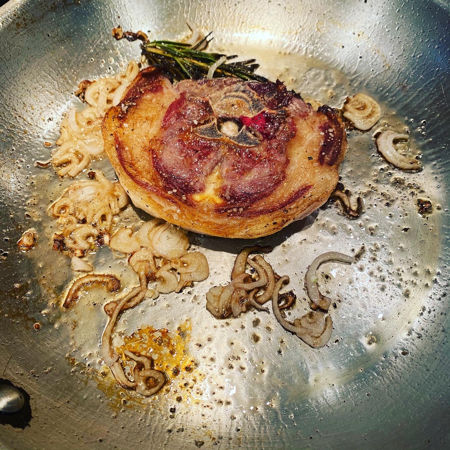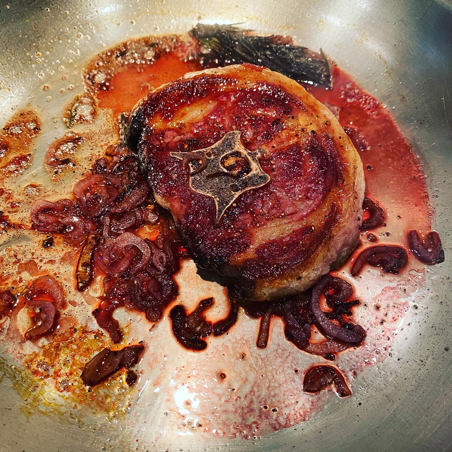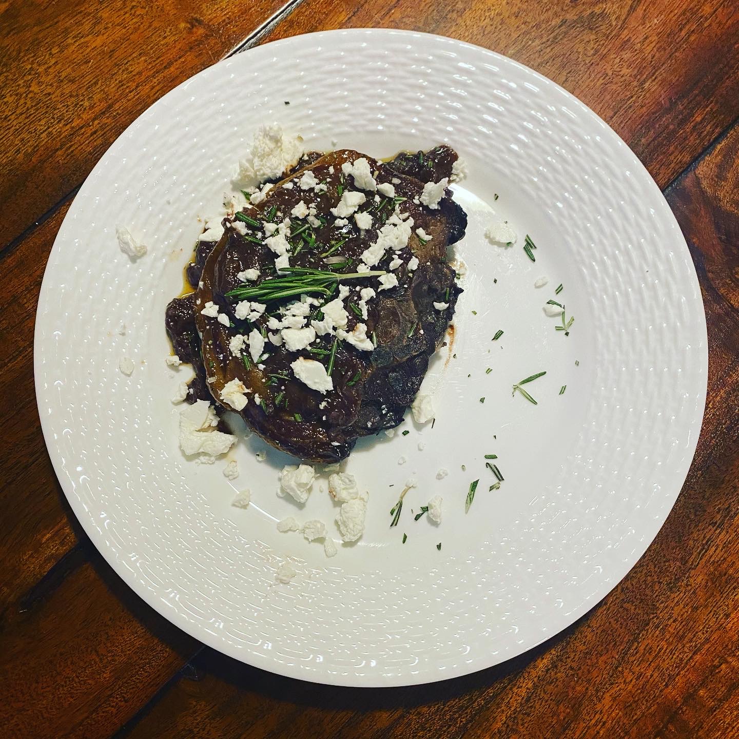 Most recipes for lamb neck call for a long slow cook, but I just had a slice and I didn’t have three hours. I started by searing it on both sides in butter, oil, and rosemary, about five minutes per side. Then I added in some sliced shallot and cooked that down for a minute or two. I deglazed the pan with red wine and then added a cup of vegetable broth. I simmered it on low turning every fifteen minutes or so for about an hour. I finished it off with chopped fresh rosemary and crumbled feta cheese.