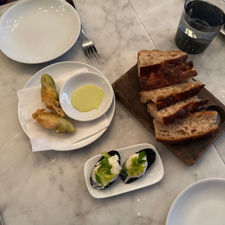 One of my favorite restaurants in Boston is SRV. I love the creativity and execution of their menu. The atmosphere of the dining room and the back patio is charming through and through. The Groundhog Day reference that accompanies “Vermouth of the Day” on the menu makes me smile every time I read it. I was a little sad when they went on winter break during the pandemic and excited once they returned from the hiatus. To celebrate their reopening, I joined them for Sunday brunch last weekend. Although I’m going to briefly walk you through the meal, their menu changes often, so if any of these dishes sound amazing, go now.