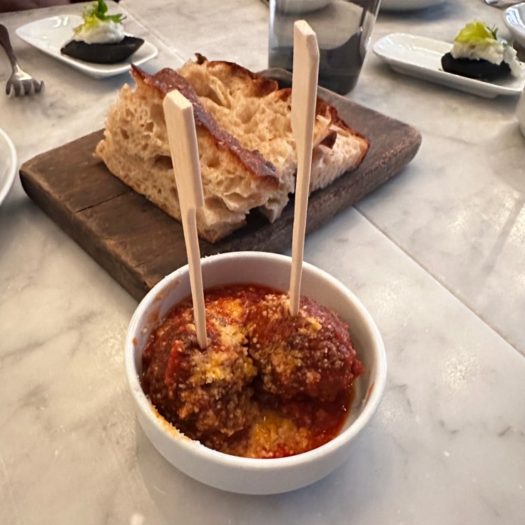 Before we dug into dessert, we went back to the cicchetti menu for one more small bite. This time we got two delicious meatballs. It’s a little family tradition to have meatballs just before dessert, or sometimes after dessert, or sometimes both. The SRV meatballs, which I have had before, are excellent. The little balls of ground pork and beef are lightly packed and, like all their other meat, incredibly tender. The only down side is not having bread to get every last bite of tomato sauce.