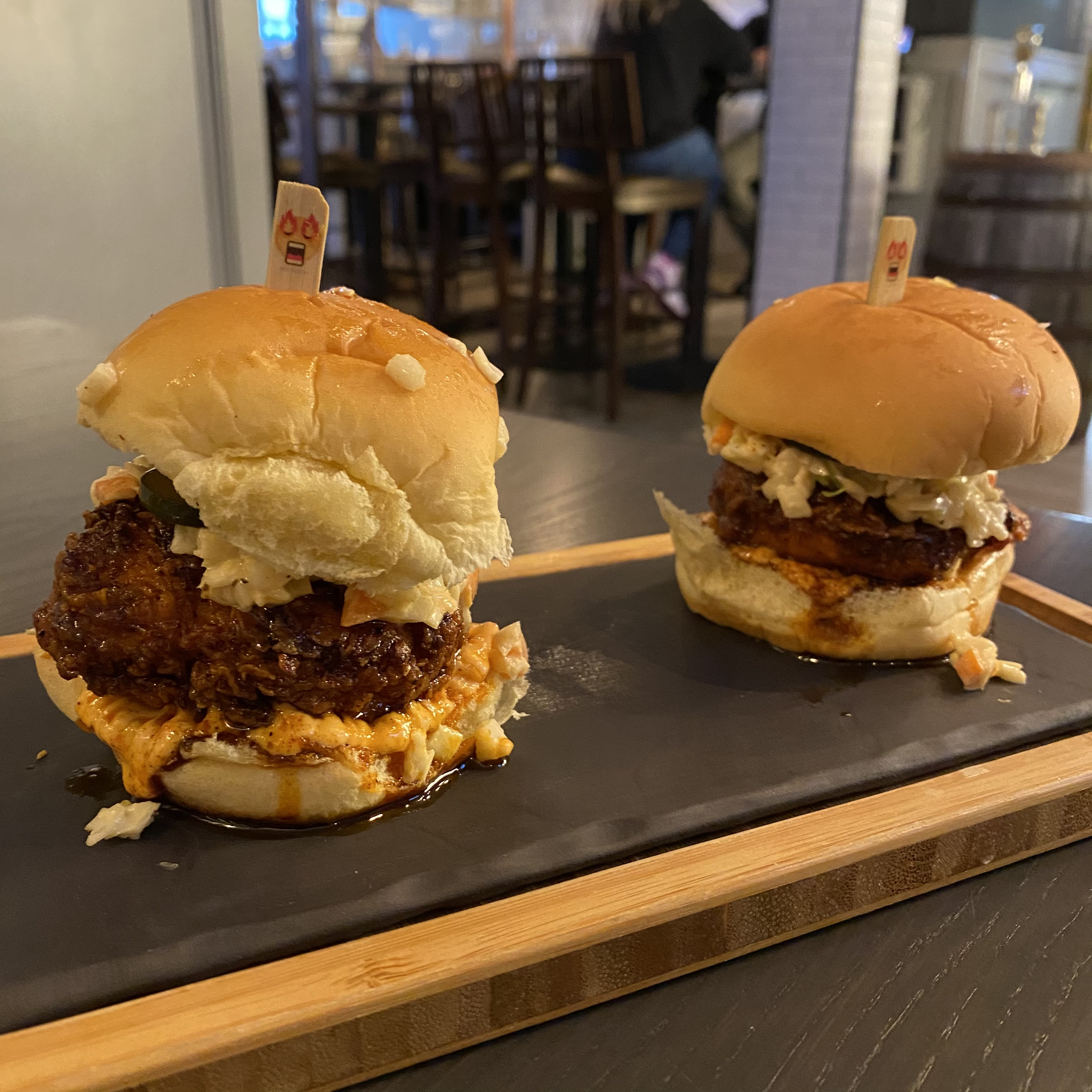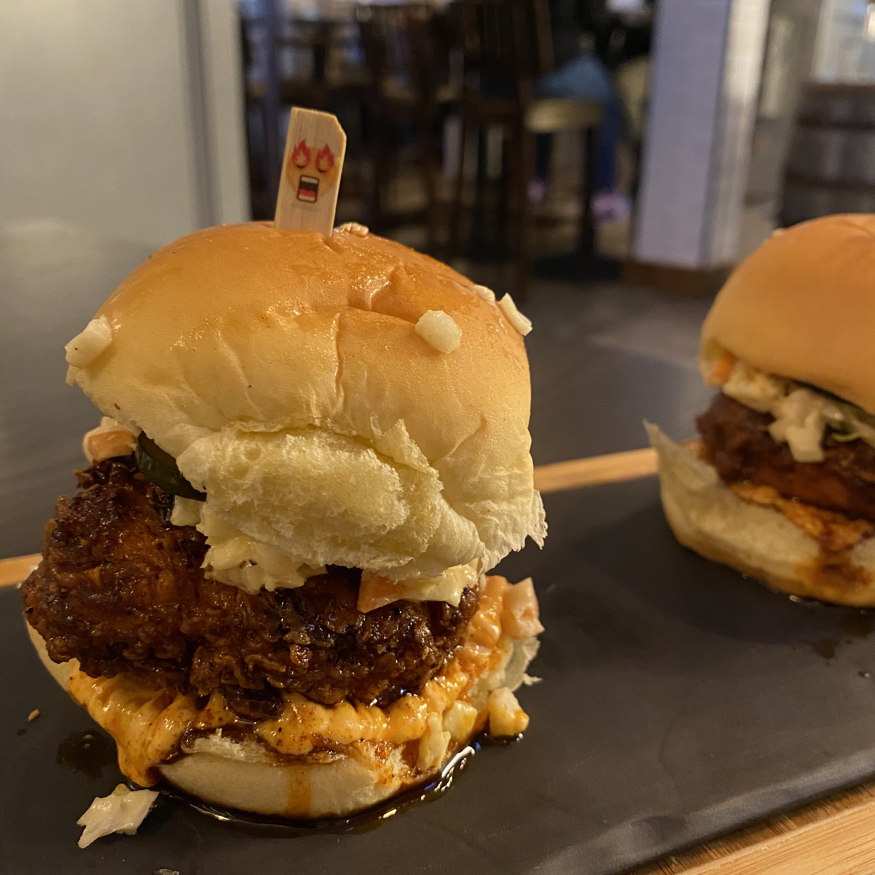 Despite the heat, there is a ton of flavor in these sliders. Spicy yes, but a little sweetness and certainly some acidity. I am absolutely in love with this sandwich. It is my favorite thing on the Smoke Shop menu and I eat them every chance I get. If you love spicy, crispy chicken, you have to try this sandwich. It’s so clucking good. (Sorry, that’s such a terrible pun, but they did it first.)