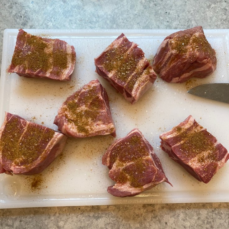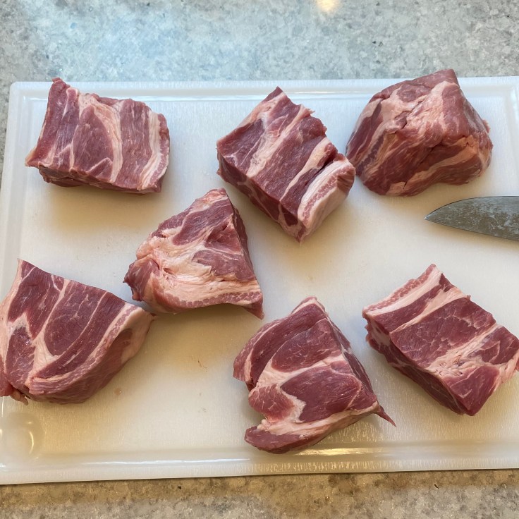 Start with a three and a half pound pork shoulder. Cut it up into six to eight big hunks. Pat the hunks dry, and then season them generously with cumin, salt, and pepper. Brown the meat in two tablespoons of neutral oil over medium heat in a large Dutch oven. They should cook about four minutes per side. Do it in two batches not to overcrowd your pot. Once the are nicely browned, remove them and set aside.