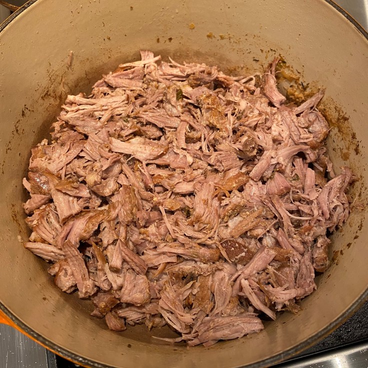 Put the lid on your pot and turn down the heat to low. This is the hard part. It needs to sit there for two hours. Make a margarita or two and wait. Waiting without a margarita is very difficult! After two hours has passed, it’s time to finish them up. With a pair of tongs, remove the pork from the pot and put it on a large cutting board. Strain the remaining liquid into a bowl. Do not throw it away! Carefully wipe out your Dutch oven with a paper towel. Then shred the pork and put it back into the pot. If you don’t mind the heat, you can shred the pork by hand, if it is too hot to handle (you could just wait a bit) or you can use two forks to shred it. Don’t use a knife to cut it up though, you won’t get the right texture.