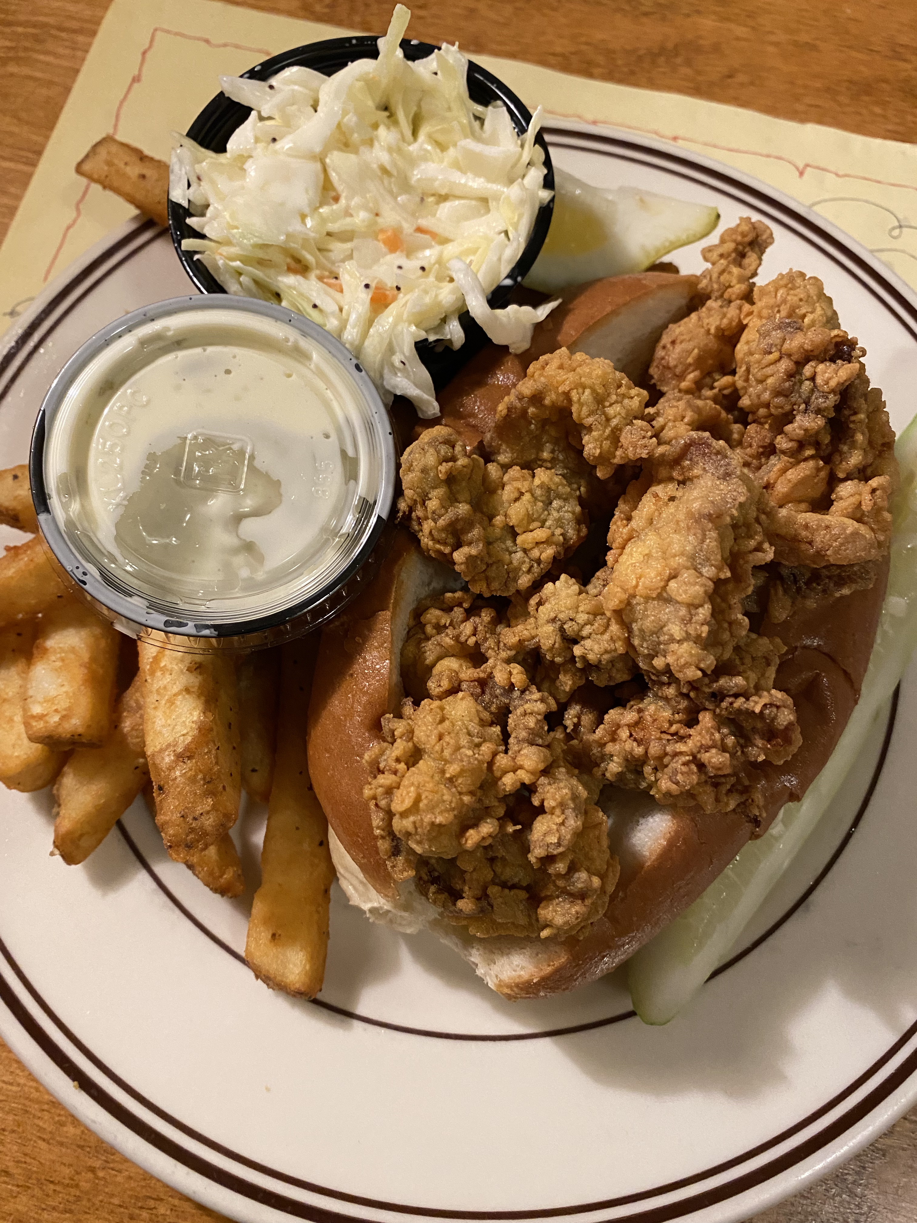 The Union Oyster House gets the unfortunate reputation as a tourist trap, and there is some truth to that: again, there’s a gift shop with oyster puppets. But the food can be good if you know what to get. You’re going to get a nice warm piece of cornbread when you sit down, and that will make you happy. Start by ordering a Daniel Webster, a brandy side car that’s a definite improvement over the brandy and water he liked to drink there. For food, begin with the clam chowder. It’s thick and rich with distinctive flavor of butter and bacon. Then, obviously, go for oysters. Since I can’t eat them raw, I went for the fried oyster roll. It arrives dry, just oysters and a bun, but it comes with fries, coleslaw, and tartar sauce. Use that coleslaw and tartar sauce to dress it up and it becomes really good. If you are still hungry, they serve a Boston Cream Pie, the city’s most iconic dessert.
