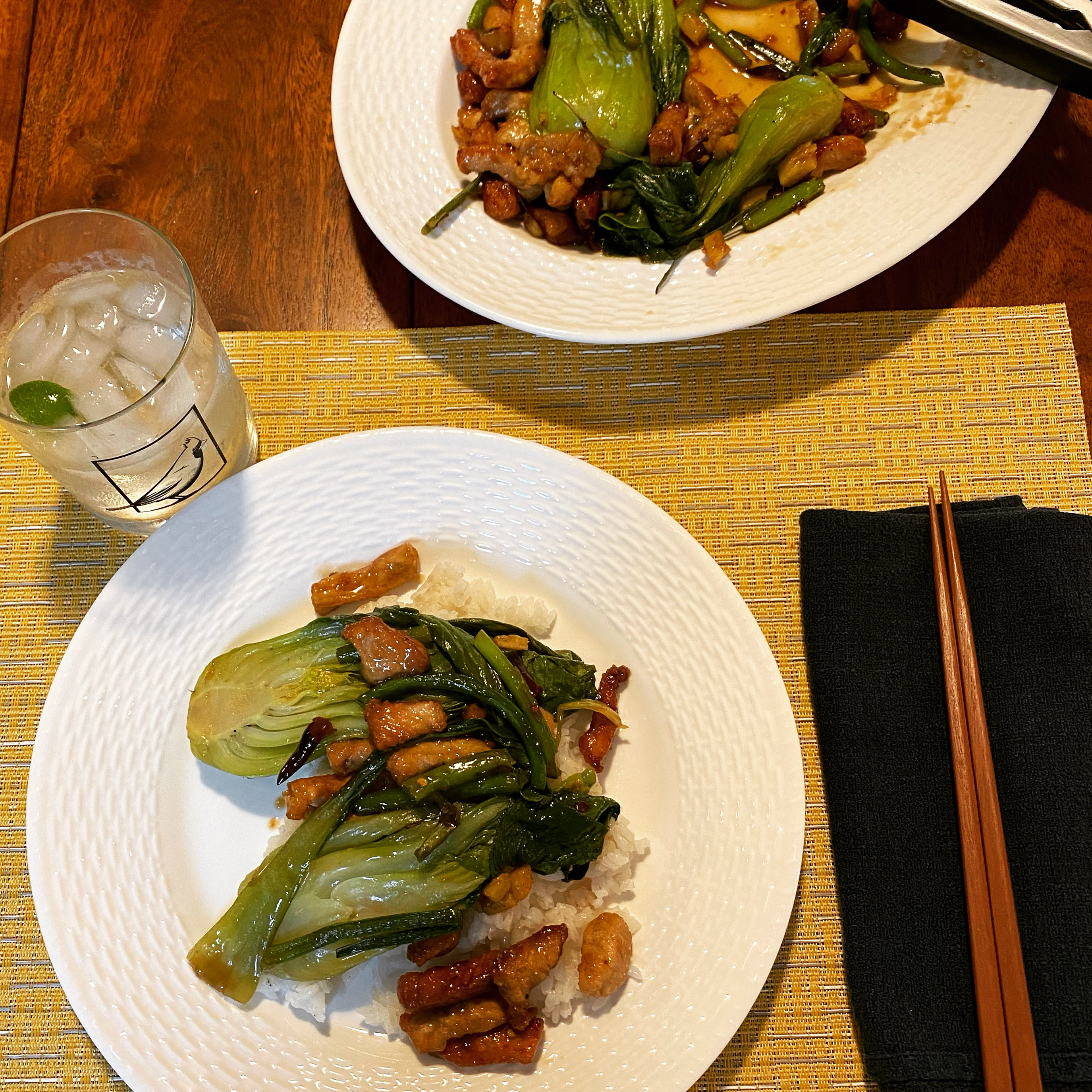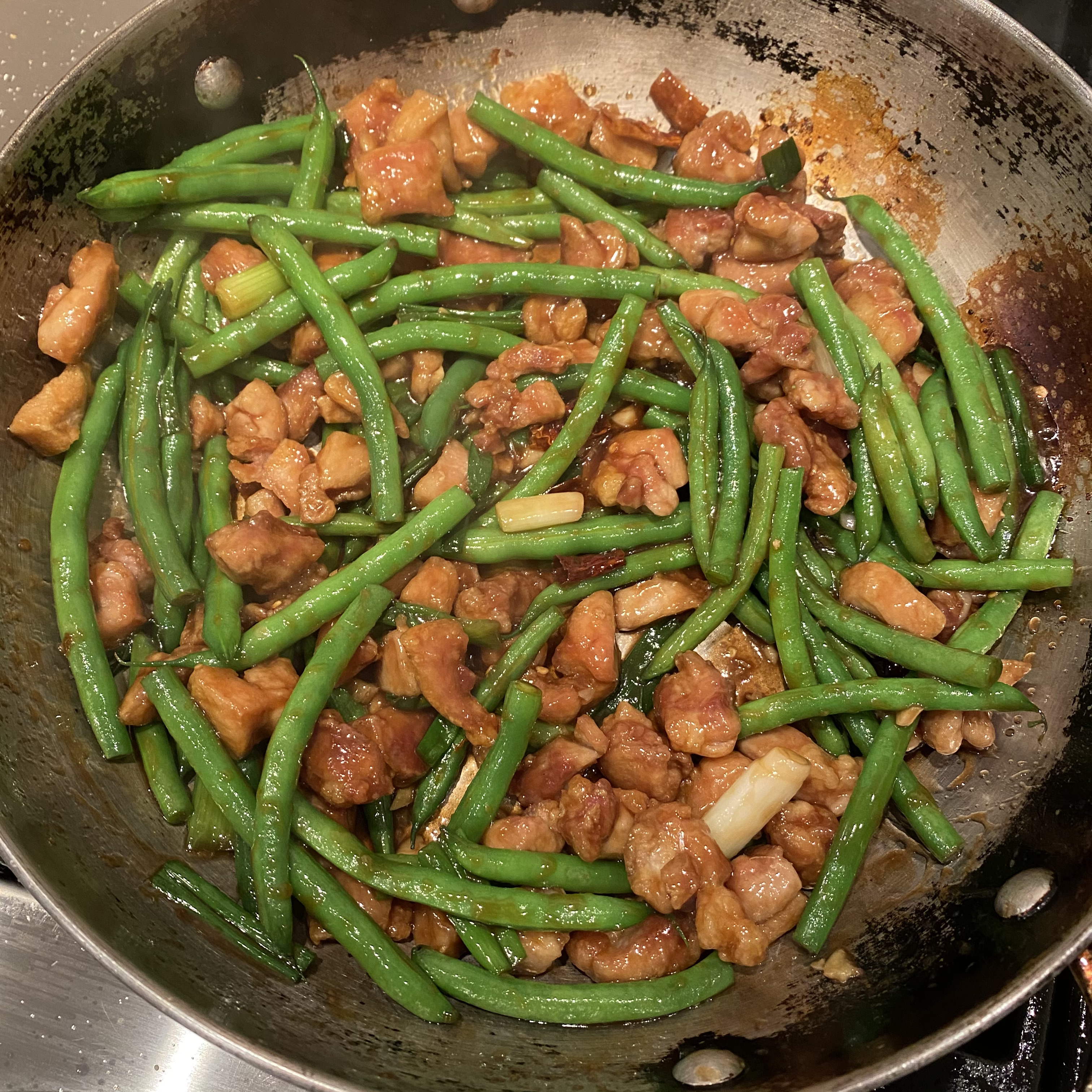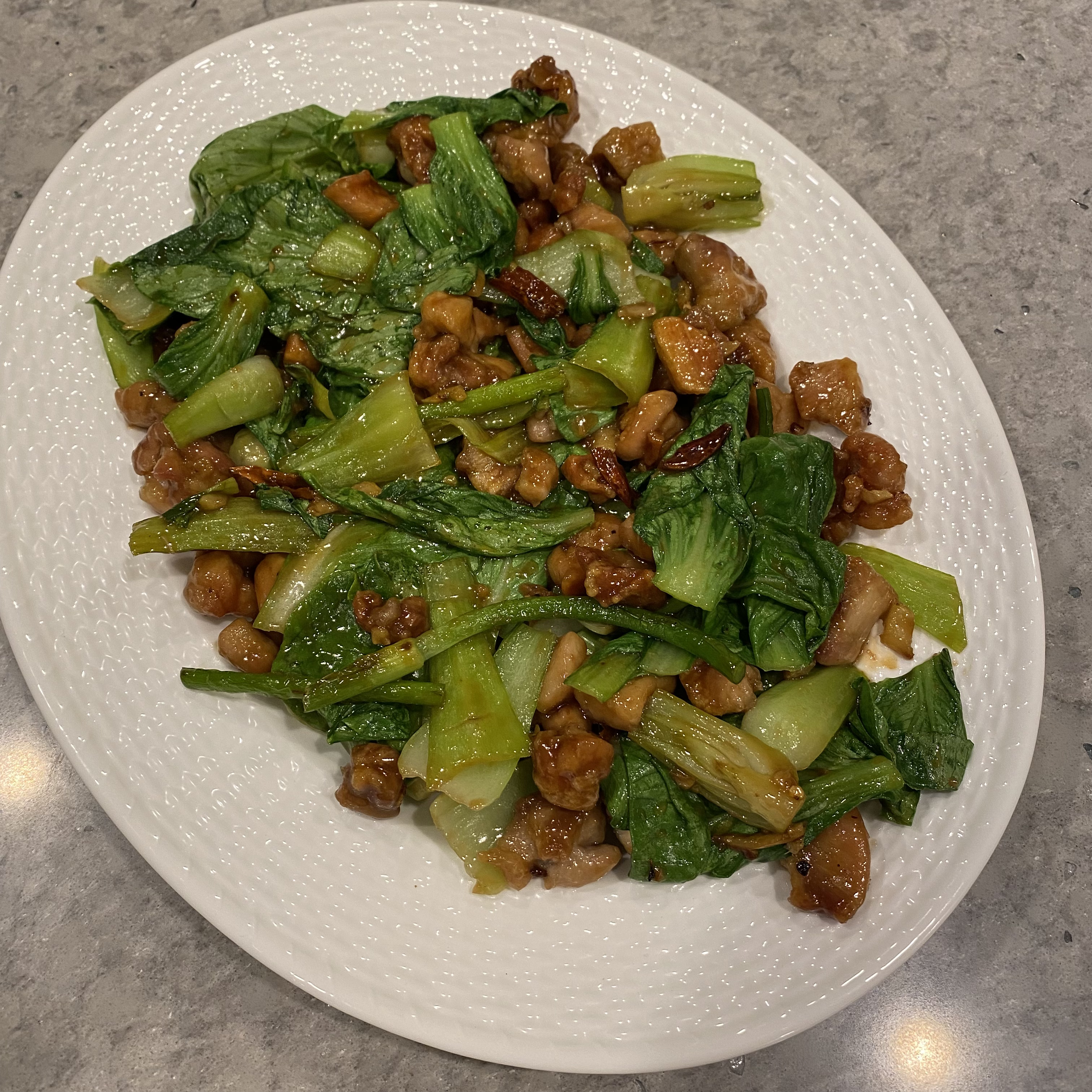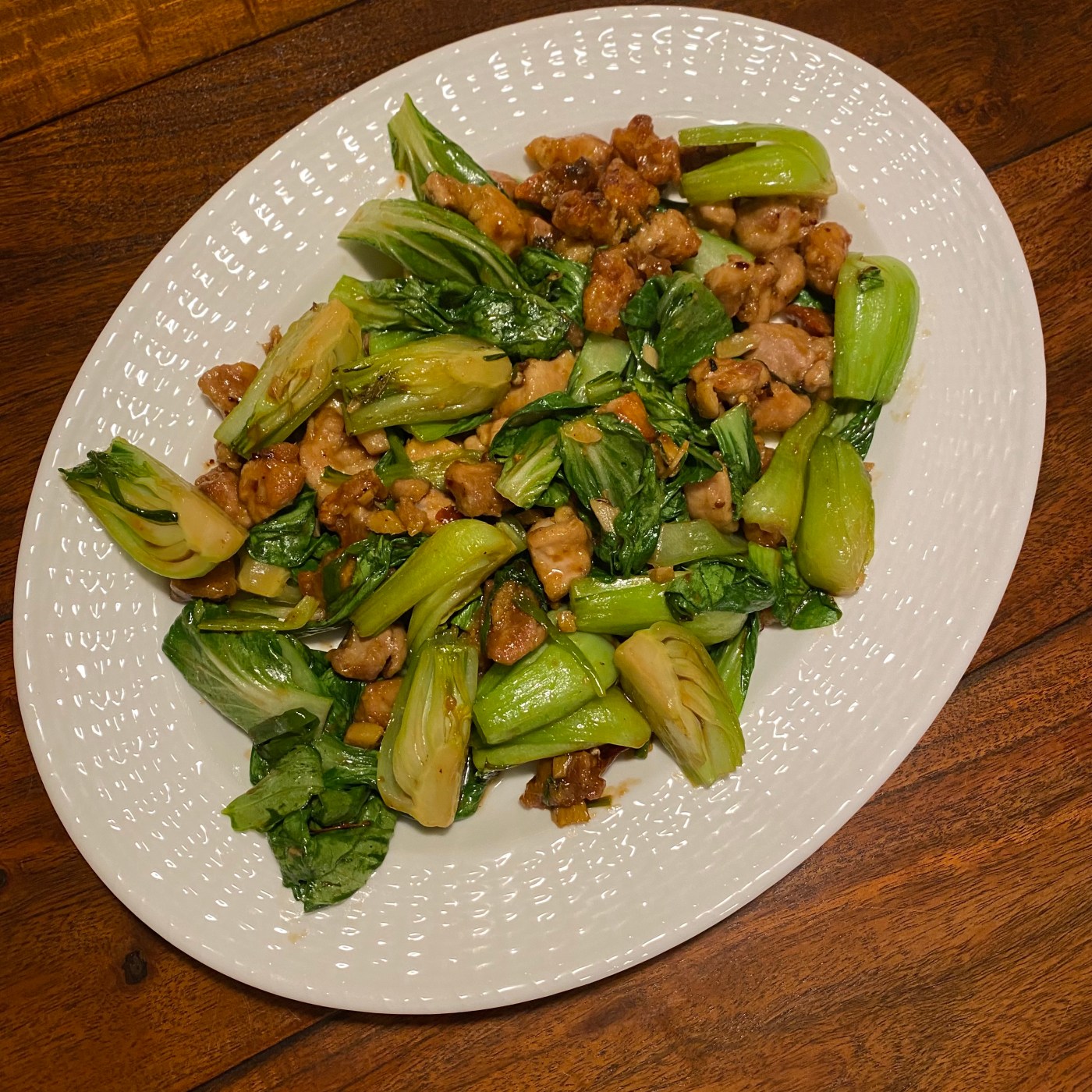 Now we are ready to cook. This come together really fast so have all your ingredients close by along with tongs or something to keep things moving in the pan. In a wok or a deep frying pan add 2T of the oil you used to cook your chicken. Start by adding the aromatics, all of them, and sauté on high for a minute or two. You should just be starting to smell them. Now add the bok choy stems and cook for another two minutes. Add the brown gravy and cook for a minute. It will thicken quickly. If it gets too thick and sticks to the bottom add water, a tablespoon at a time until it loosens up. Last, add the chicken and the bok choy leaves. Stir until the leaves start to wilt. Then turn off the heat and transfer to a serving platter.