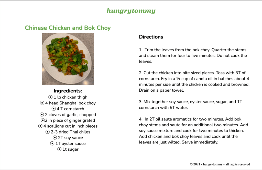 There you have it, better than take out Chinese chicken and bok choy. I hope you will give this recipe a try. If you do let me know. I’d love to know how it turned out. For more details watch the video above and for a more concise explanation, download the recipe card below. To see some variations on this dish, including chicken & green beans and pork & bok choy, take a look at these photos.
