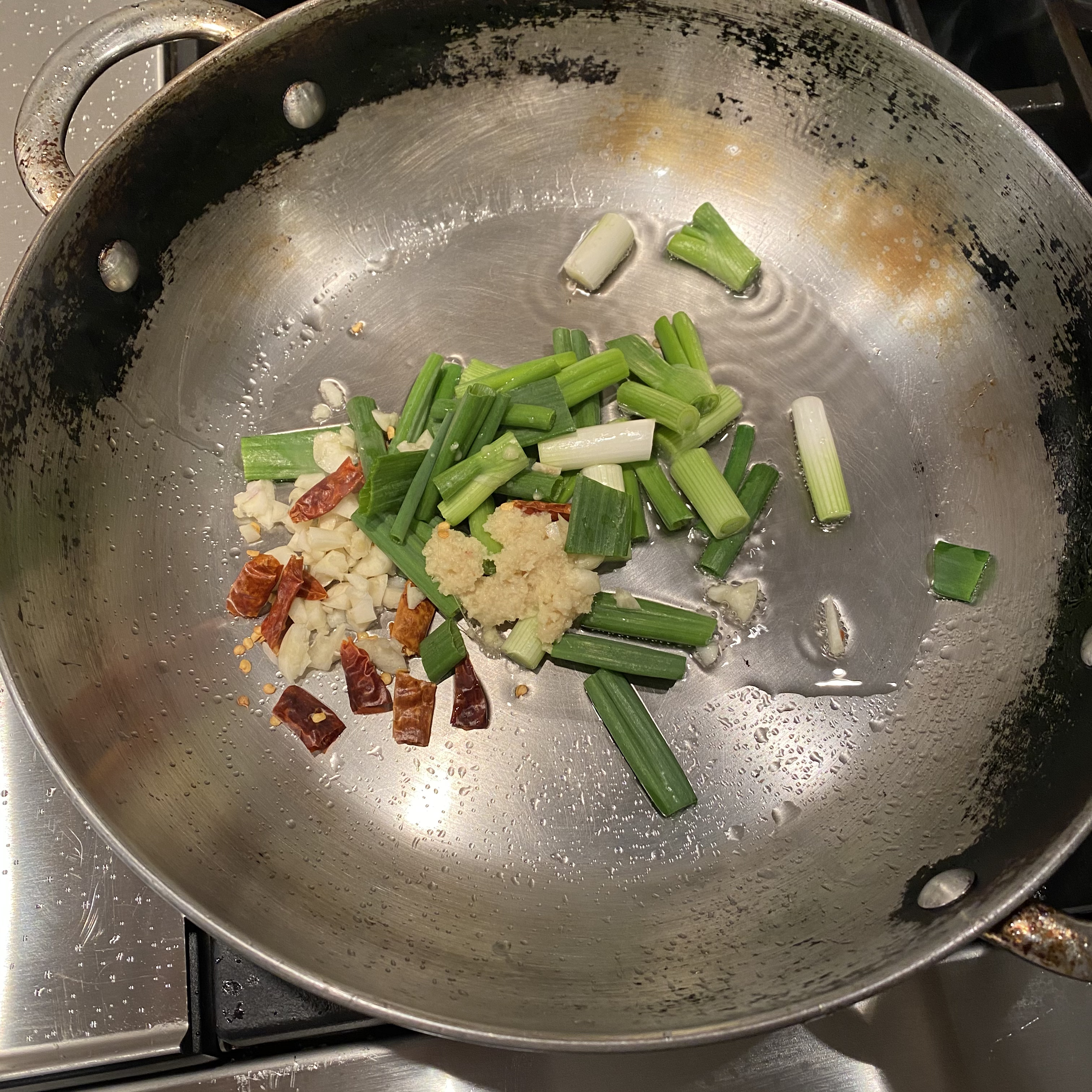 Aromatics: Most of the flavor for this dish comes from the aromatics. We use scallion, garlic, ginger, dry Thai chilis, and Szechuan peppercorns. All of these are going to be prepared and then combined in a bowl until we are ready to cook. Chop the green parts of four scallions into one inch lengths and the white parts into half inch lengths. Finely slice two medium garlic cloves. Peel a two inch piece of ginger and bash it with a meat tenderizer or a frying pan. Then chop it. Break up two dry Thai chilis. These can be very hot so if you don’t like spice maybe omit them. Finally, add a quarter of a teaspoon of Szechuan peppercorns. If you can’t find them you can skip them or use black pepper, but I really like the flavor this gives. If you have to, go on Amazon and buy a bag for eight bucks.