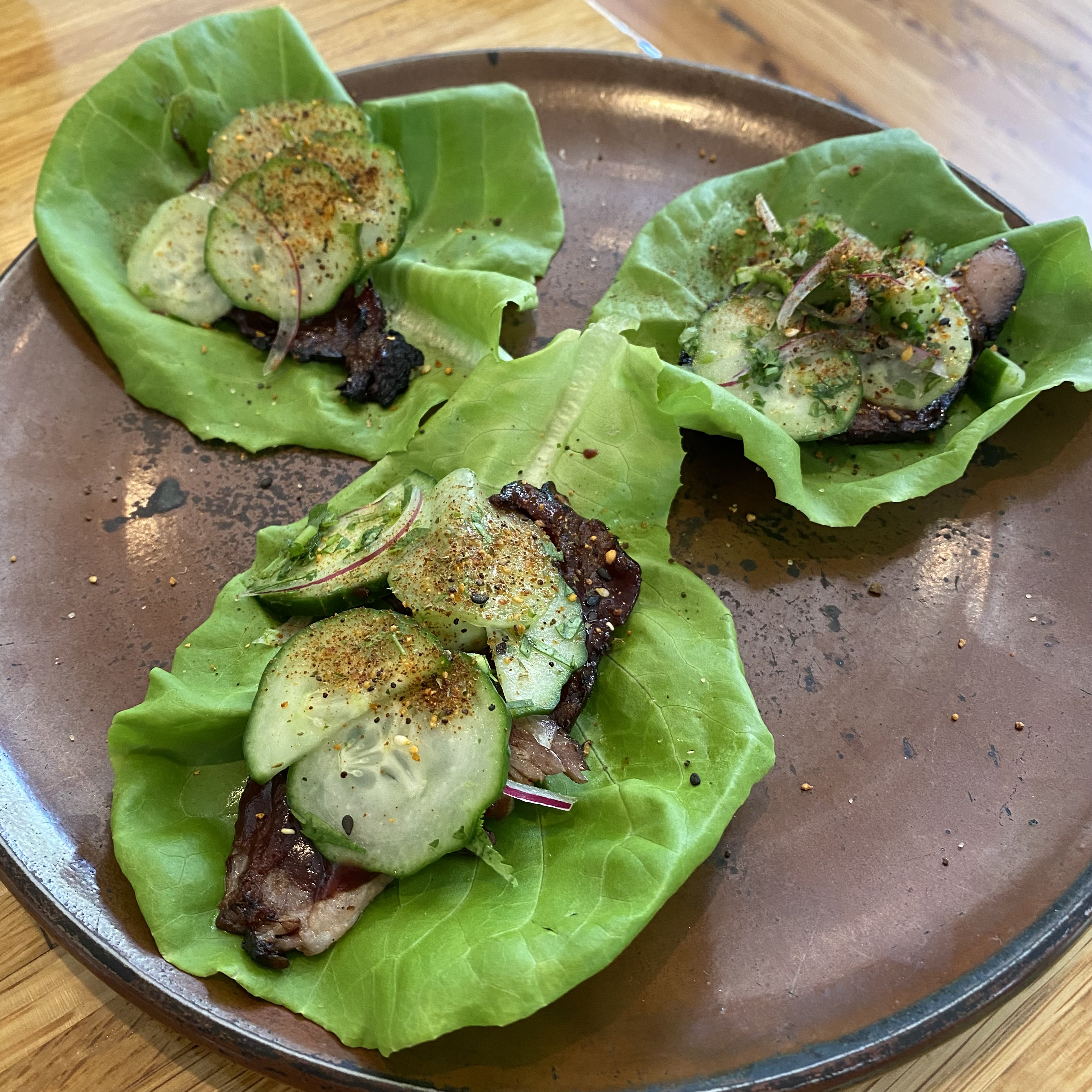 A delicious strawberry scone with a pink vanilla glaze was our first bite at Husk. It was ordered for my three year old, but I ate more than half of it. After that came Chinese barbecue pork lettuce wraps. These were not only the best thing I ate at Husk, but maybe the best thing I ate in my week in the South. The pork they use comes from the Peculiar Pig Farm which happened to provide the excellent pork chop I had at Lenoir the night before. We followed that with house made cheddar bologna, fried and served simply with pickled vegetables and mustard. The pickled jalapenos went particularly well with rich bologna. It is a seemingly simple but excellent dish.