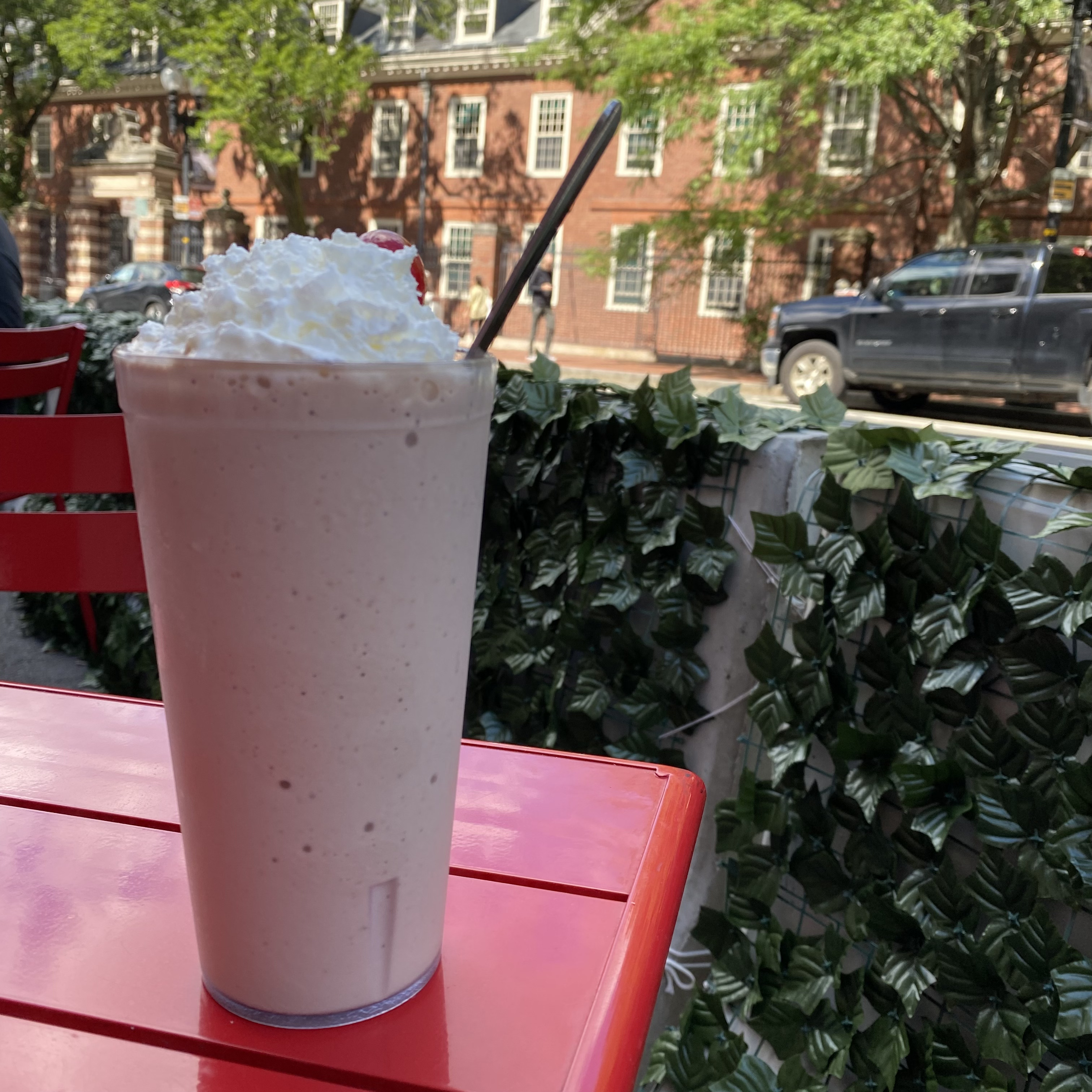 Today I went with the Boston Cream Pie frappe. I’m not sure why they call it this since the only thing it has in common with a Boston cream pie is chocolate, but really who cares because it is awesome. They start with their basic chocolate frappe and blend in banana and graham crackers. Then they top it with whipped cream and a cherry. It is sooo good.
