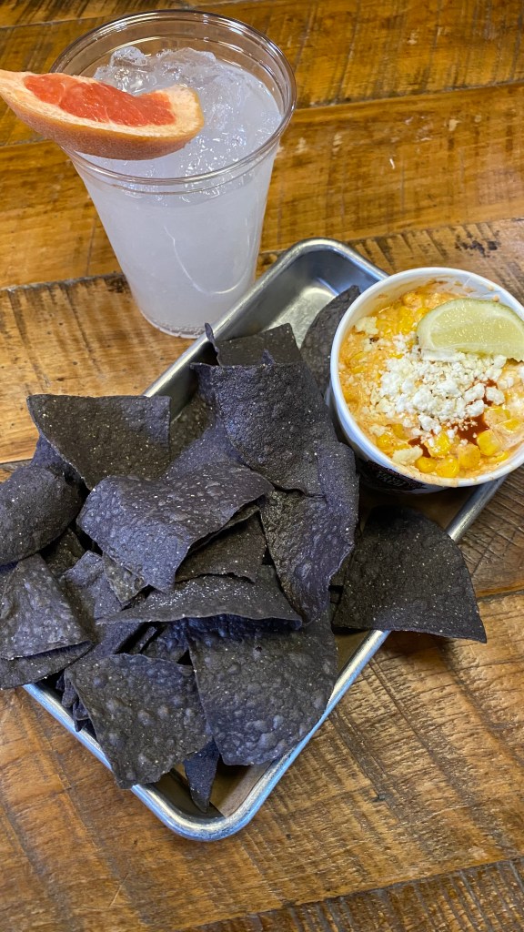 My favorite part of the meal, besides the paloma, was the elote and chips. I didn’t really know elote until this trip, but it quickly became one of my favorite foods, the Velvet Taco version being my favorite. In addition to corn and cheese, they add Valentina hot sauce, making this a slightly spicy version that you can eat with the blue corn chips that come with it, or just on a spoon. It is so good, I might drive to Charolette to get some. It’s only about twelve hours away.