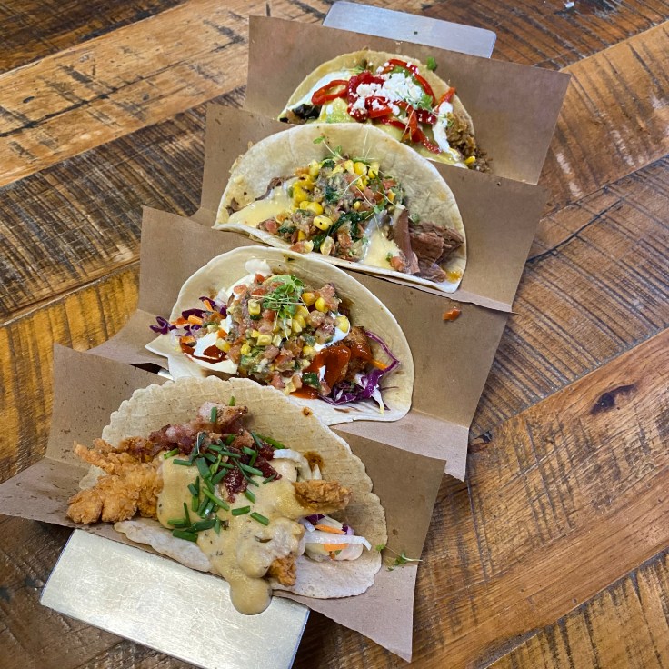 Velvet Taco is a chain with locations in six states, and five locations in Dallas alone. That might make some people worry, but put your fears to rest. Their food is great. We got four tacos: the chicken and waffle, the green chile pork, the slow roasted angus brisket, and the Mexi-Cali shrimp.