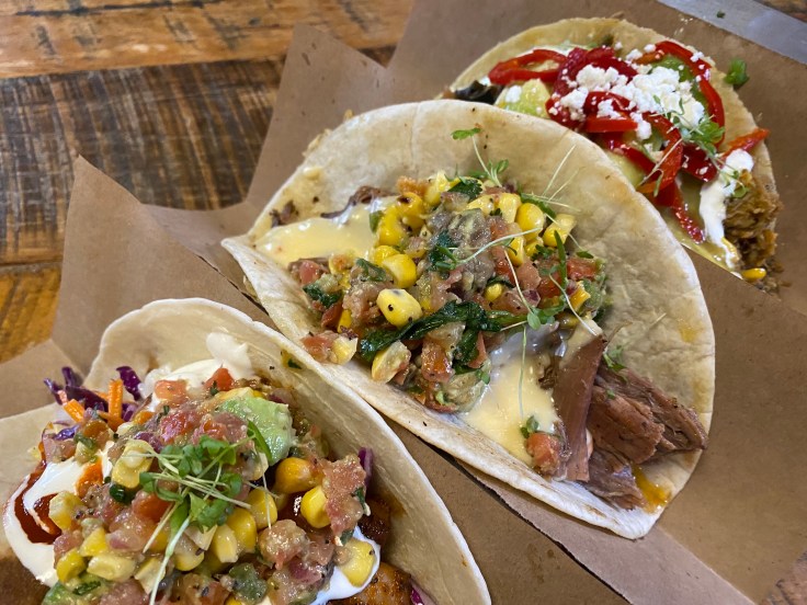 I have a hard time deciding which taco came in second. The green chile pork taco starts with tomatillo corn stewed pork then adds avocado, mayo crema, queso fresco, pickled fresnos, cilantro rice, salsa verde, and micro cilantro on a corn tortilla. And the Mexi-Cali shrimp taco takes blackened shrimp and tops it with napa slaw, citrus lime crema, sriracha, avocado corn pico, and micro cilantro. All of this is served on a flour tortilla. Both were worth getting again.