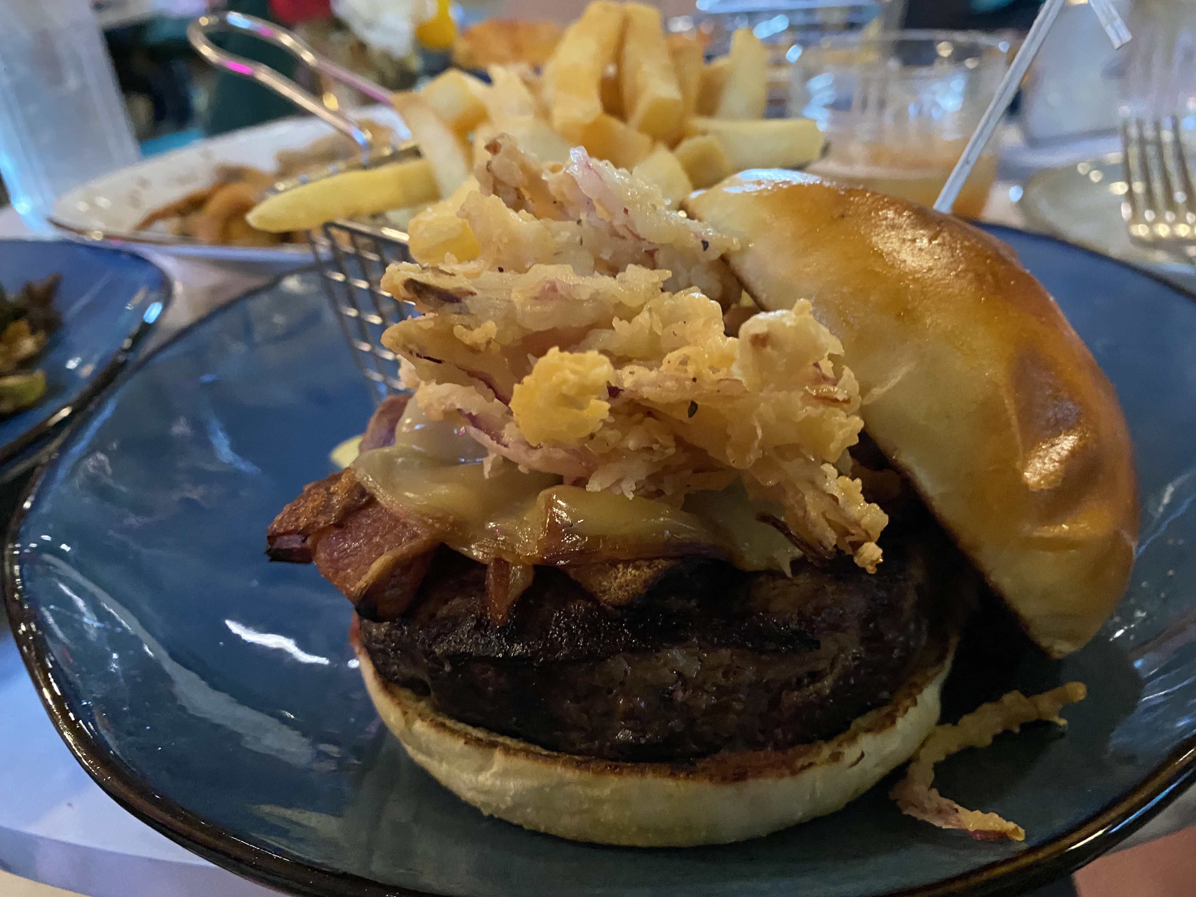 Opening night meal was wings, a burger, and brussels sprouts. The wings are small and crispy, served with a very nice jalapeño ranch dipping sauce. The Bourbon-Glazed Burger is pleasantly sweet and topped with onion straws and bacon, as well as gouda. The beef blend is very good and even though the burger was slightly over cooked, it remained juicy. The most interesting dish was the Blistered Shishito Peppers and Roasted Brussels Sprouts. It is seasoned with allepo pepper and honey. Although I haven’t seen this combination before, it works. The brussels, though big, were beautiful browned, a dish I would certainly get again.