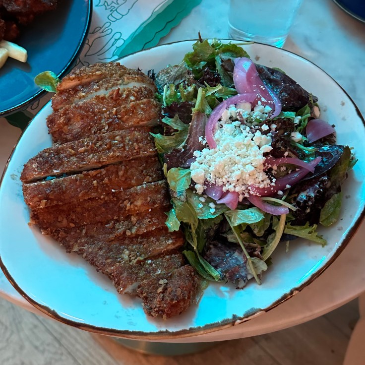 I had a surprisingly good pecan crusted chicken salad. The chicken was really delicious and the salad which came next to it included mixed greens, goat cheese, pickled onions, and a honey mustard dressing.