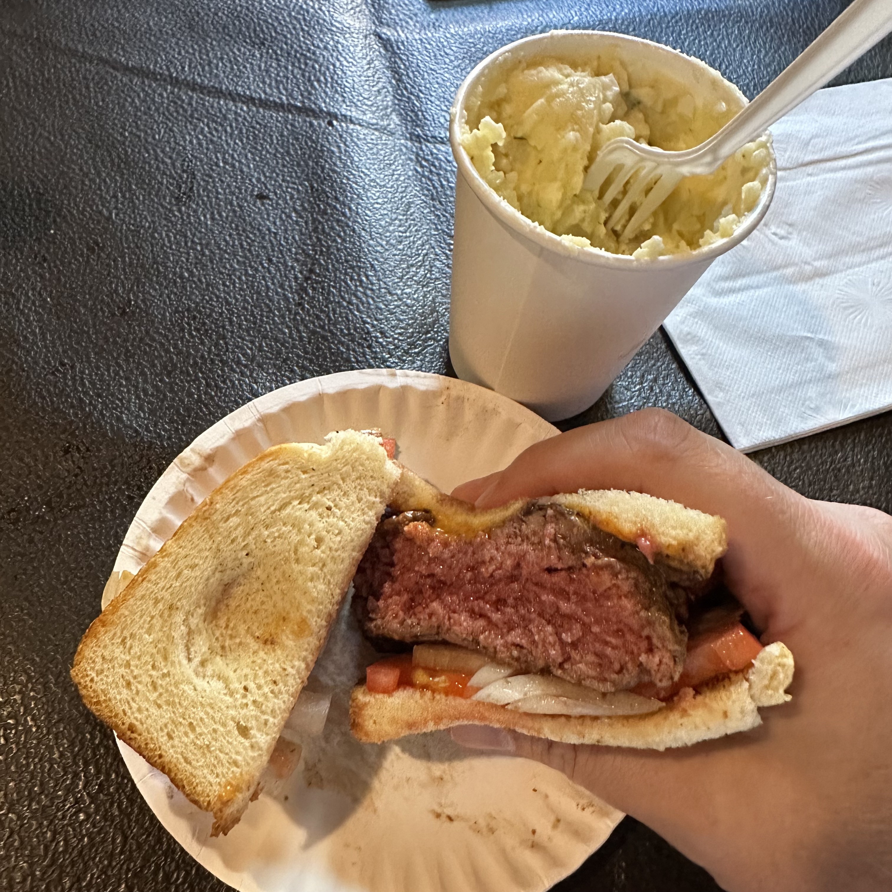 The burgers themselves are served with tomato and onion, but never ketchup. Never. They have a strict no ketchup policy. You can get cheese and if you want to, and if you want to sound like a regular, order it “Cheese top and bottom.” For a side, it’s potato salad, which is loaded with hard boiled eggs. For a drink go with a root beer or a birch beer. For dessert there’s pie.