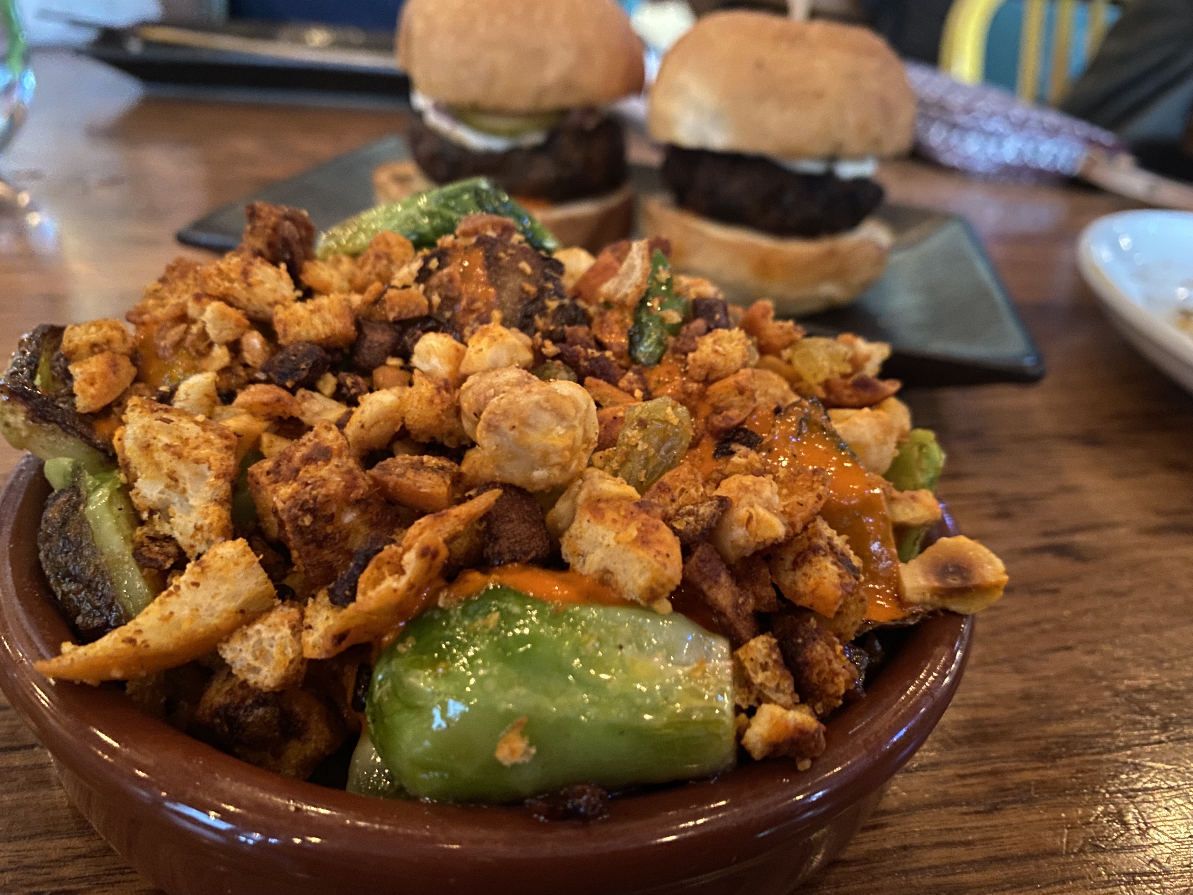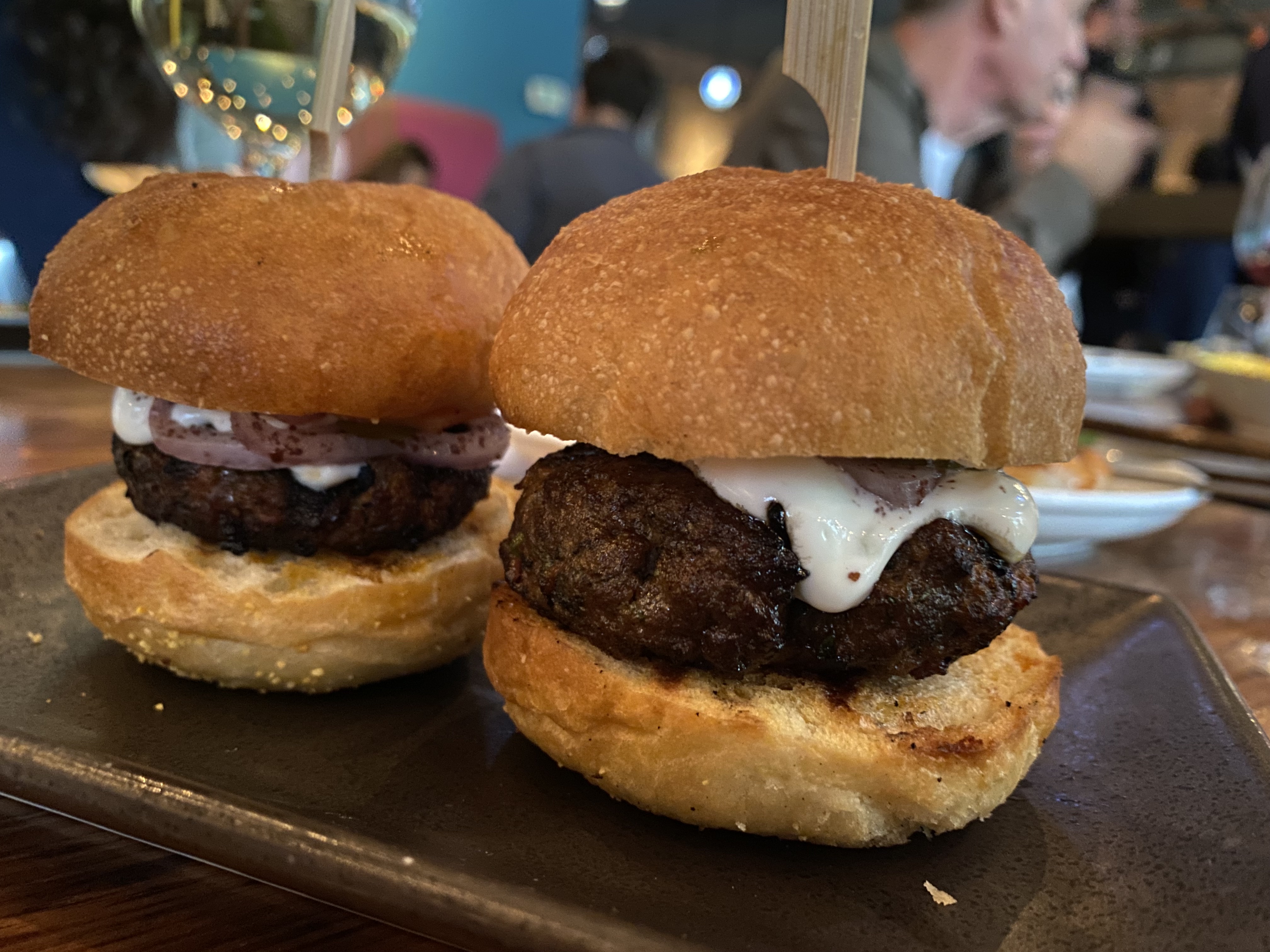 Lamb Kofte Sliders continued the parade of heavy food. These not so small burgers were flavorful and rich. Bold lamb flavor and sumac onions dominated the dish. They were delicious but with a side of fries could have been a complete meal all by themselves. The Brussels Sprouts Bravas, a play on patatas bravs, came out just seconds later. For an additional two dollars they come with chorizo. They also come topped with hazelnuts so I was on my own to eat them all.