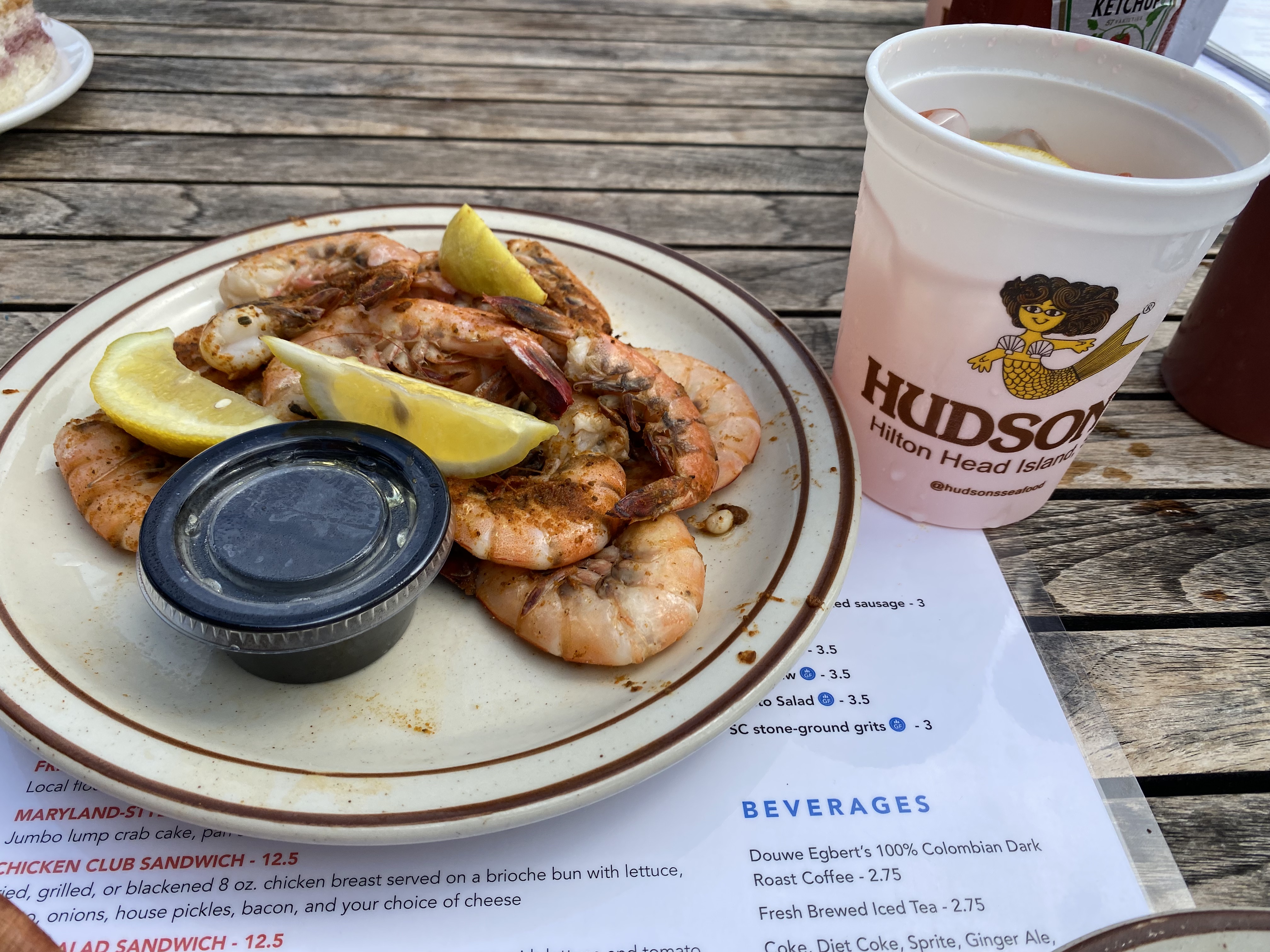 There is one dish I will never skip when visiting Hilton Head, peel and eat shrimp at Hudon’s. Steamed Local Shrimp in the Shell appears on their dinner, lunch, and brunch menus. You can get 1/3 of a pound for $10 or 2/3 of a pound for $17. Heavily seasoned in Old Bay and served with lemon and clarified butter, you might want to order it twice. Wash it down with their Lowcountry Lemonade, an enticing blend of peach whiskey and pink lemonade.