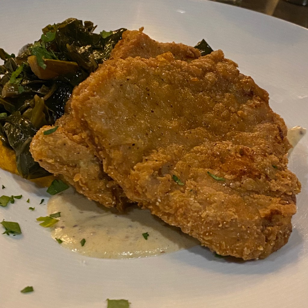 I considered just recommending collard greens at Lucky Rooster because they are that good. I love collards and have eaten them many places, but these rank right near the top. On our visit, they were served with “Some Pig,” a breaded and fried pork cutlet, the aforementioned collard greens, sweet potato puree, and a mustard cream sauce ($30). The pork is from Peculiar Pig Farms, the same farm that sources pig for Lenoir and Husk in Charleston. It was all delicious, but those collard greens will be the memory I’ll hold onto the longest.