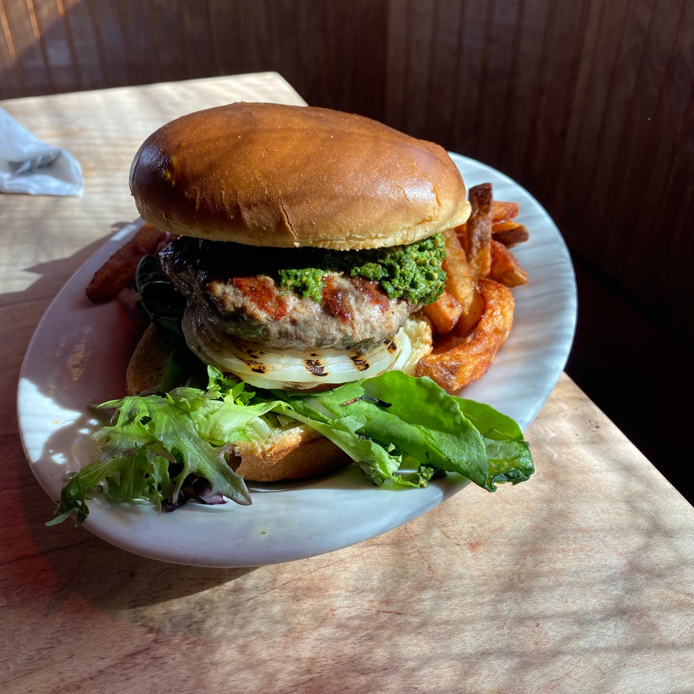 An off menu special, the lamb burger, was served medium rare on a soft bun with greens, tomato, and grilled onion, and topped with pesto. The lamb was juicy and flavorful. If you are a regular reader of mine, you know I can’t stand it when lamb tastes like beef. In this burger, you know the lamb is lamb. The special cost $15 and came with a generous side of Druid chips, french fries. The fries are best enjoyed drenched in malt vinegar, which is of course on the table.