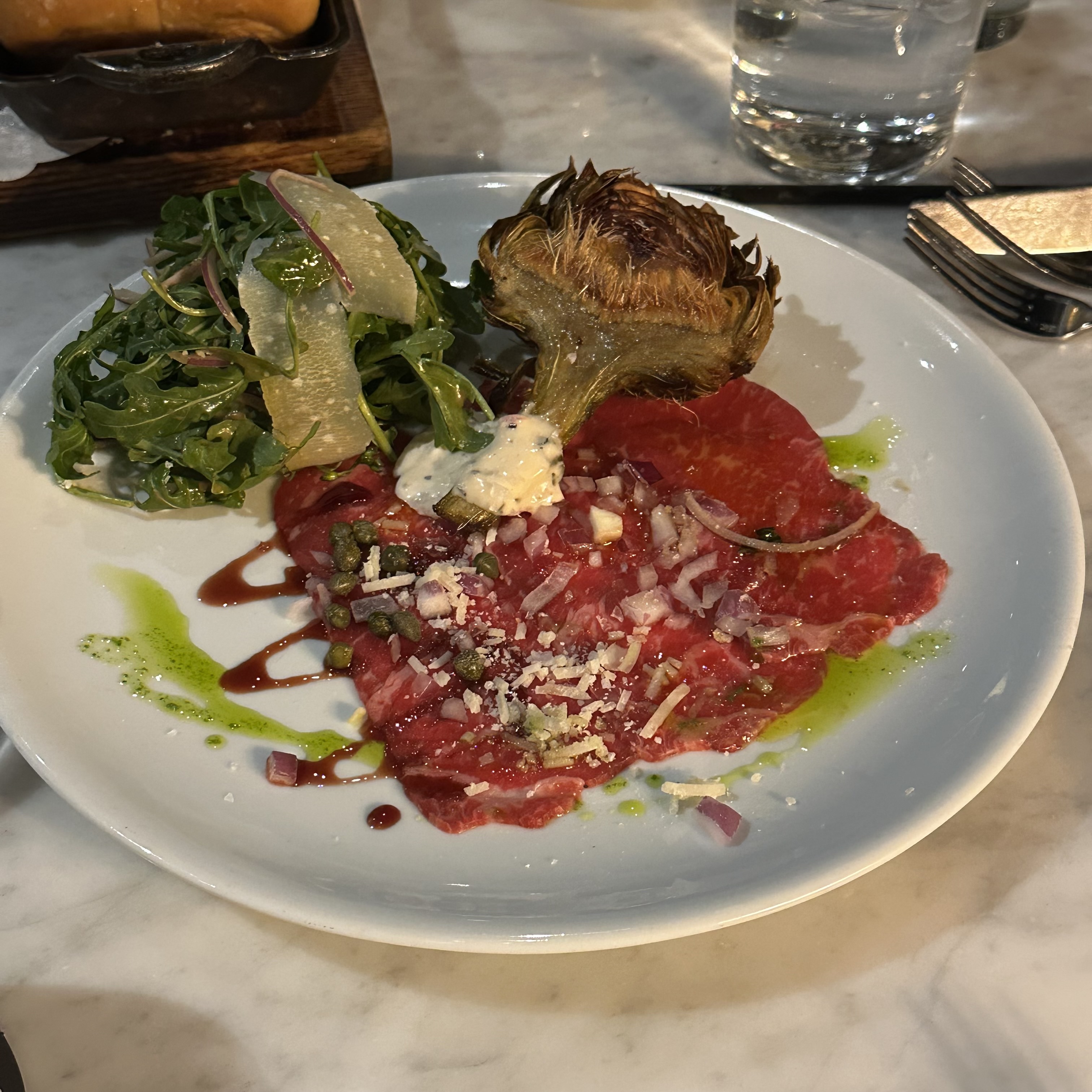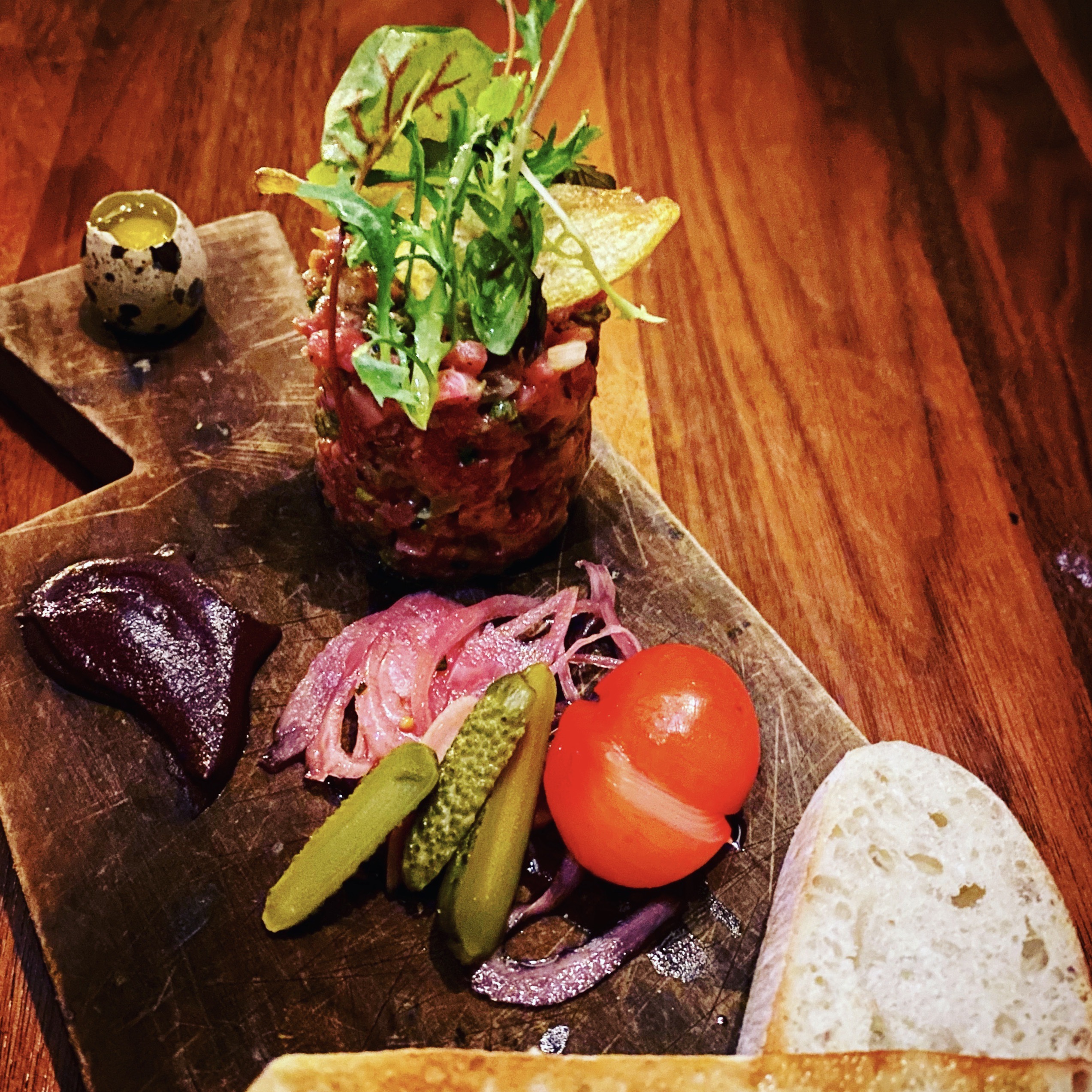 Another favorite of mine is the steak tartare. Served with a raw quail egg, toast, and an assortment of pickled vegetables, this dish always hits. Given how rare I eat my steak, I don’t usually get tartare if I’m going to get a steak. Instead, I get the shrimp cocktail, steak tartare, and a side of fries for a perfect meal.