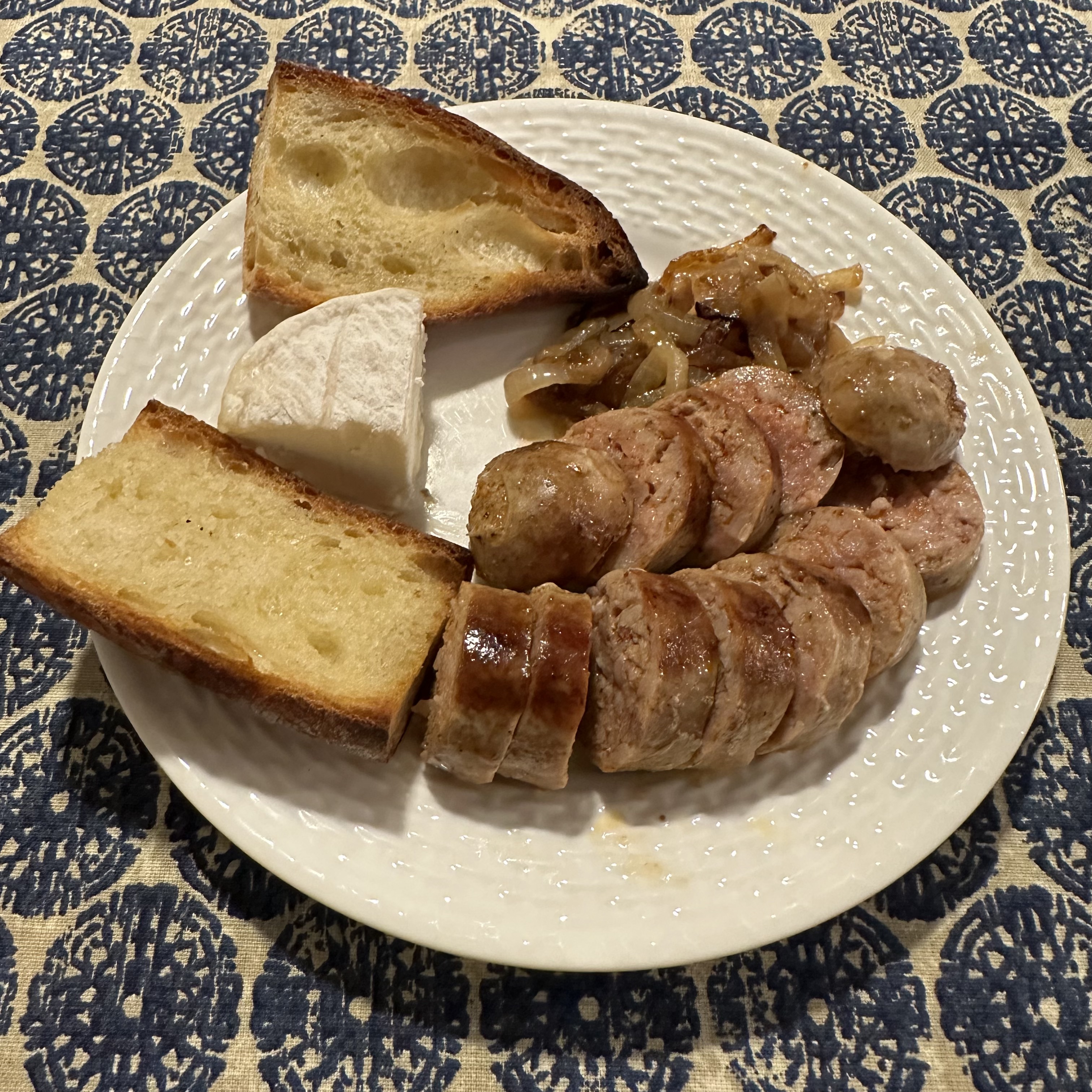 For dinner, I made sausage. I got really good sausage from Formaggio Kitchen when I was shopping for New Year’s Eve. Basque sausage is made with local pork and seasoned with garlic and espelette pepper. I also made some sautéed onions and served it with left over toasted baguette and St. Johnsville goat cheese.