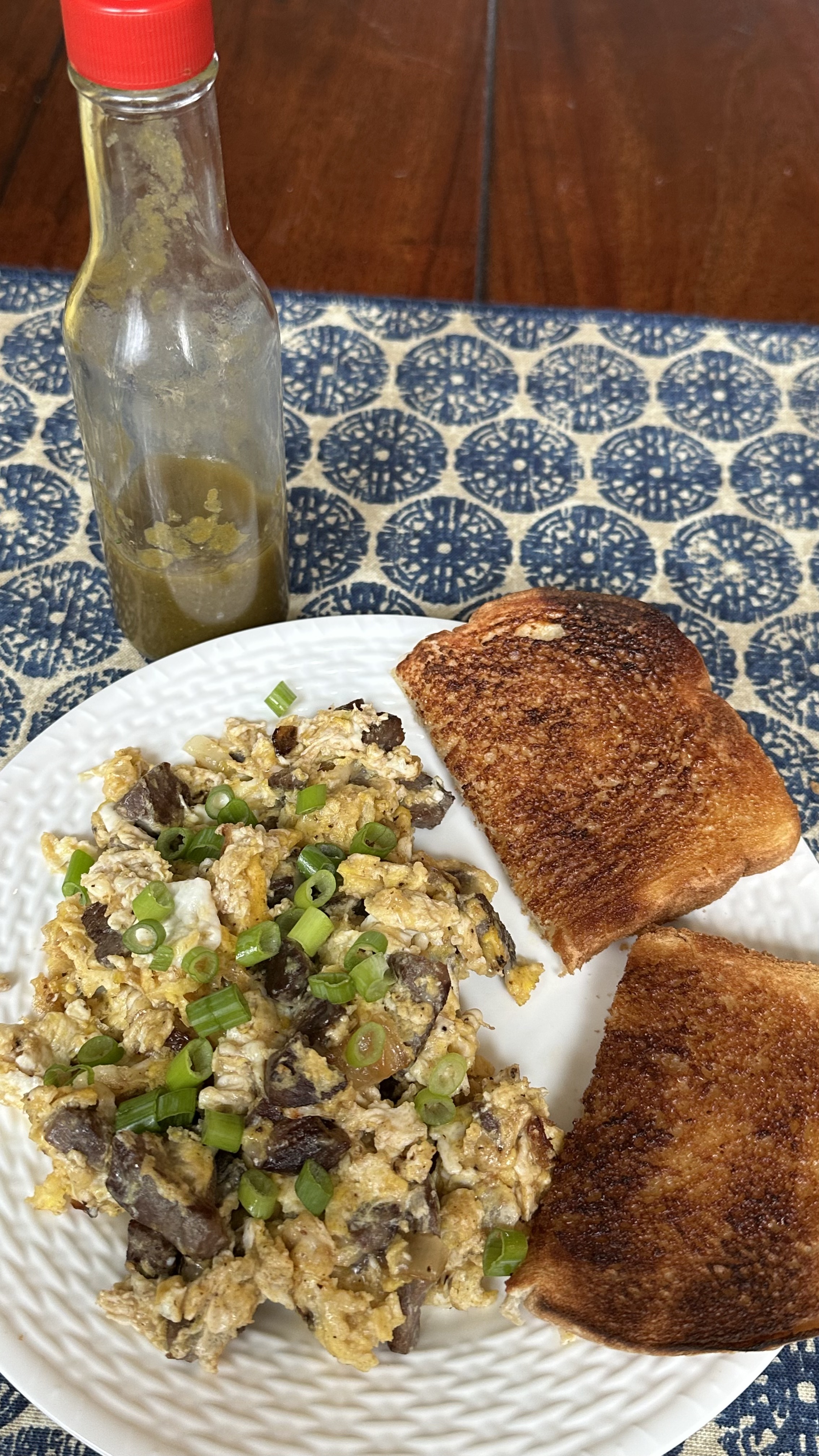 I had big plans for cooking today, but I took a nap instead. I was on my own for brunch so I made steak and eggs with a pice of toast. I scrambled two eggs with left over elk tenderloin, a little diced onion, and a bit of shredded Brebis du Haut-Bearn cheese. I garnished it with some diced green onion and my homemade garlic-green chili hot sauce. Good start to the day.