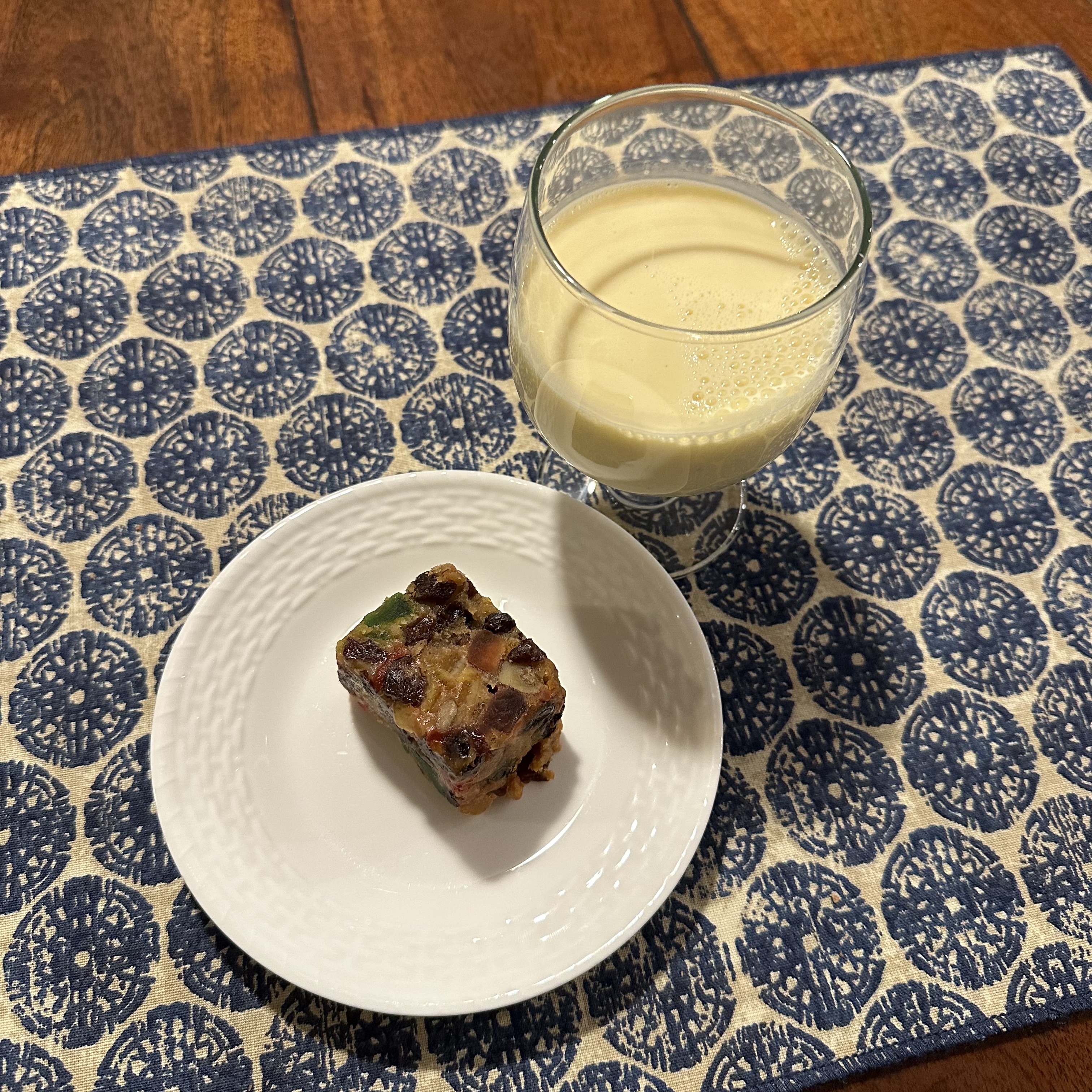 For dinner, I got take out from Ken’s, the chicken kebob wrap. I also had a few Pop Chips. For dessert I had a slice of Claxton Fruit Cake that my brother gave me for Christmas and a glass of egg nog without any booze.