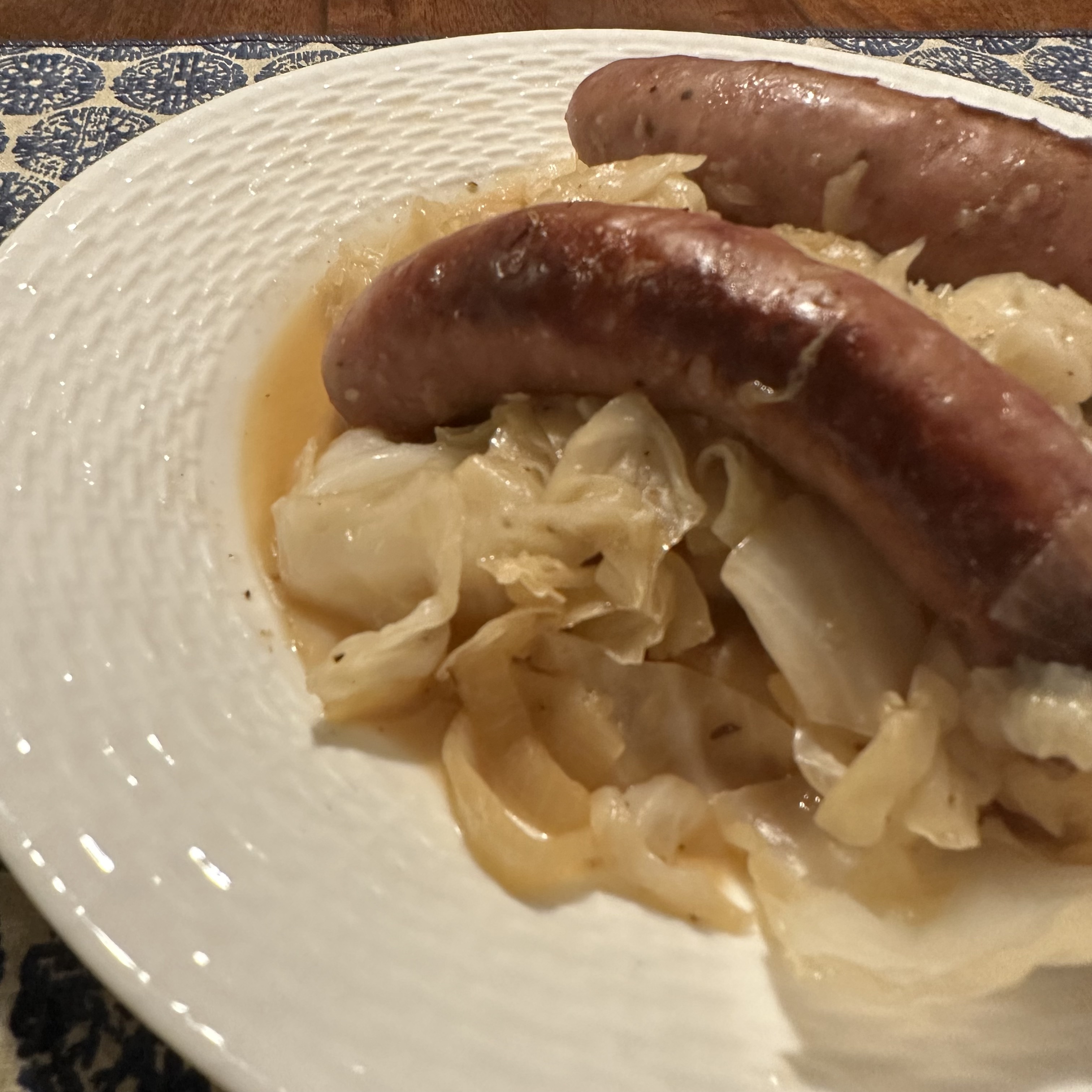 For dinner I made cabbage and sausage. It’s in my regular rotation, but tonight I used some Italian sausage instead of my usual bratwurst. For the cabbage, I sautéed onions and a granny smith apple, then braised it in apple cider and dijon mustard. I served it over a pice of toast.