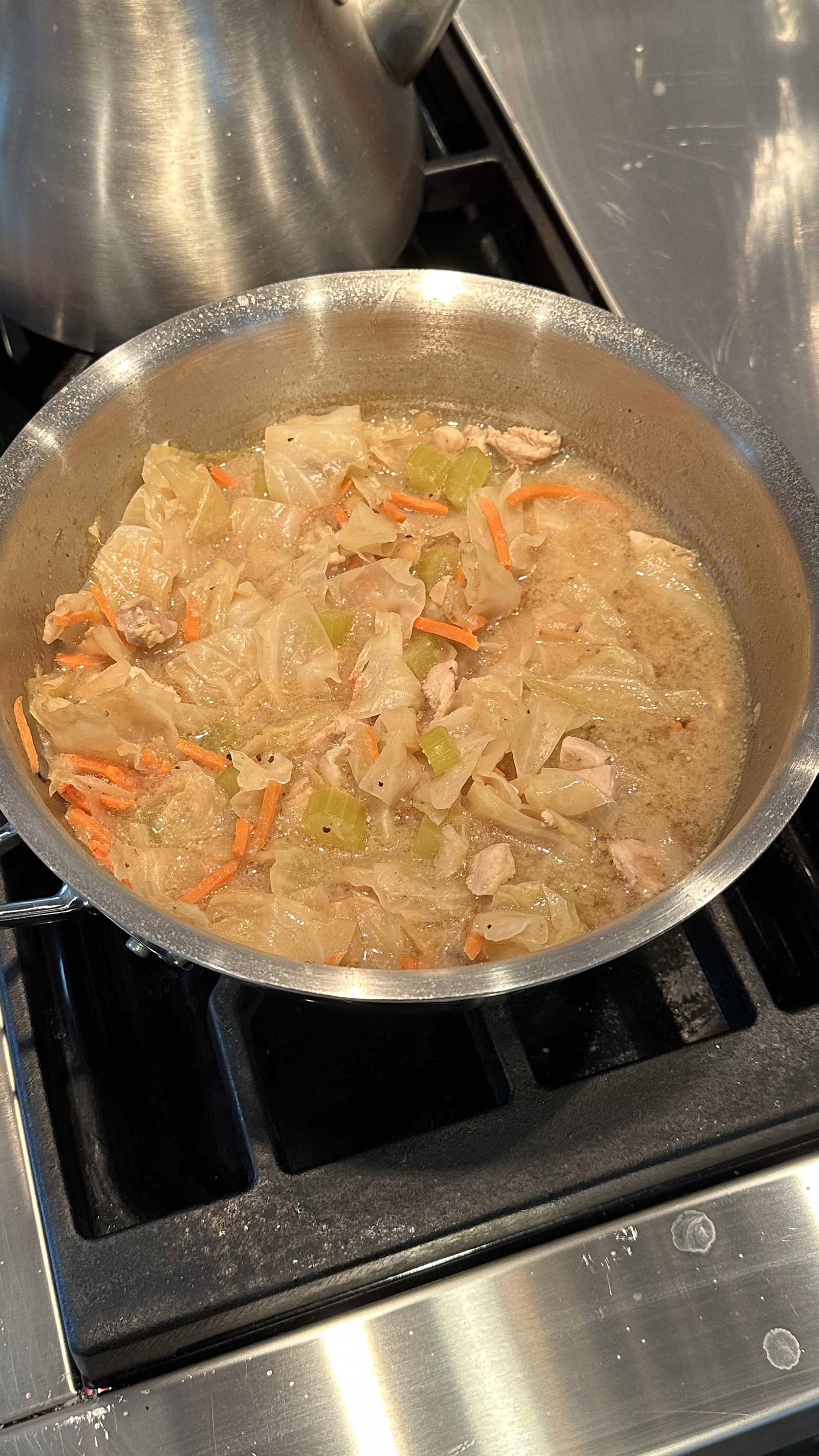 For lunch today, I used up the leftover cabbage from last night. I had some chicken, chicken broth, carrots, and celery in the fridge. I put it all together and made a very good cabbage soup.