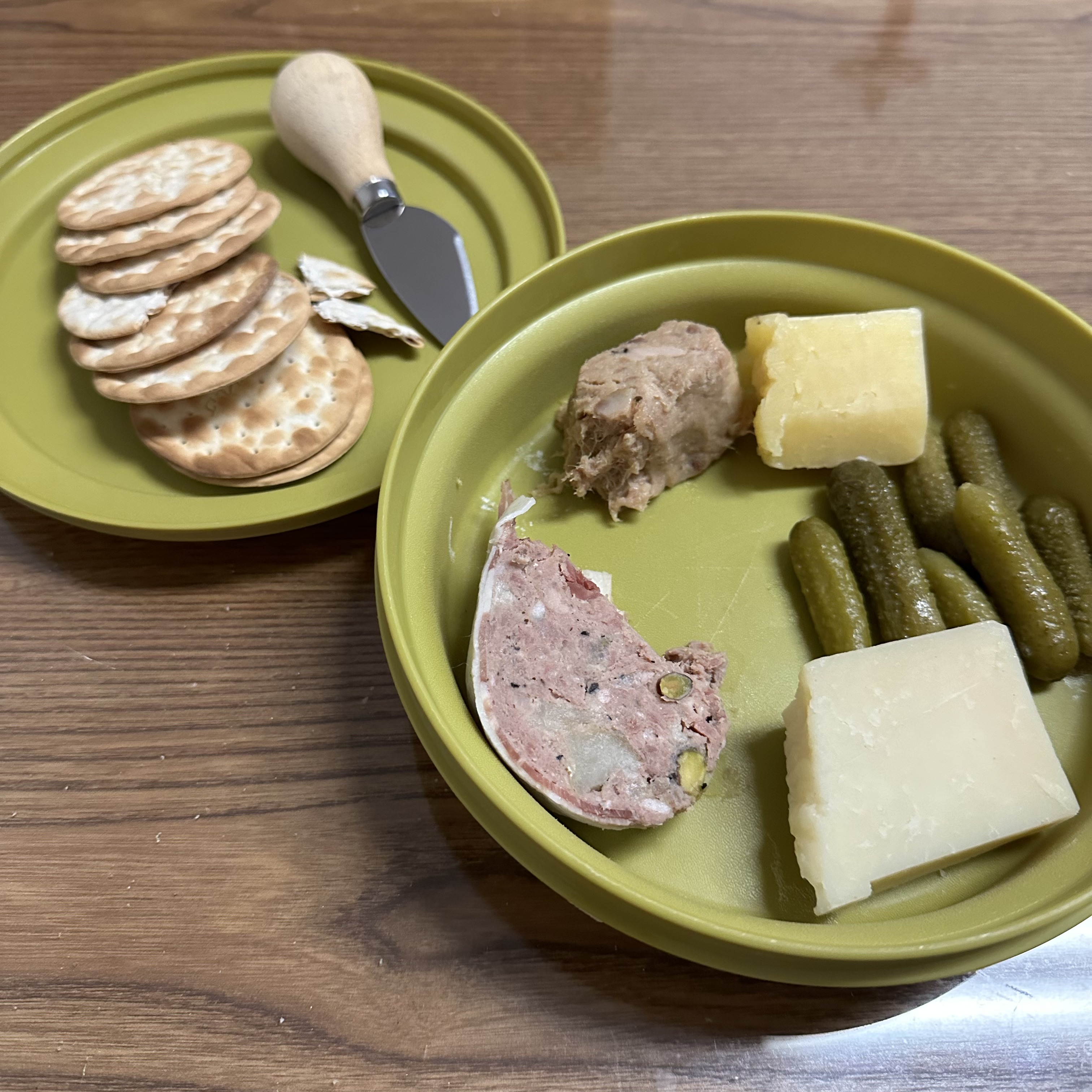 I had been doing good all week. My weight was down, I was eating good food, but not too much of it, and then came Friday. Really lunch wasn’t too bad. I finished off the New Year’s Eve charcuterie. I had a couple pieces of cheese, rabbit pate, pork rillettes, cornichons, and some crackers.
