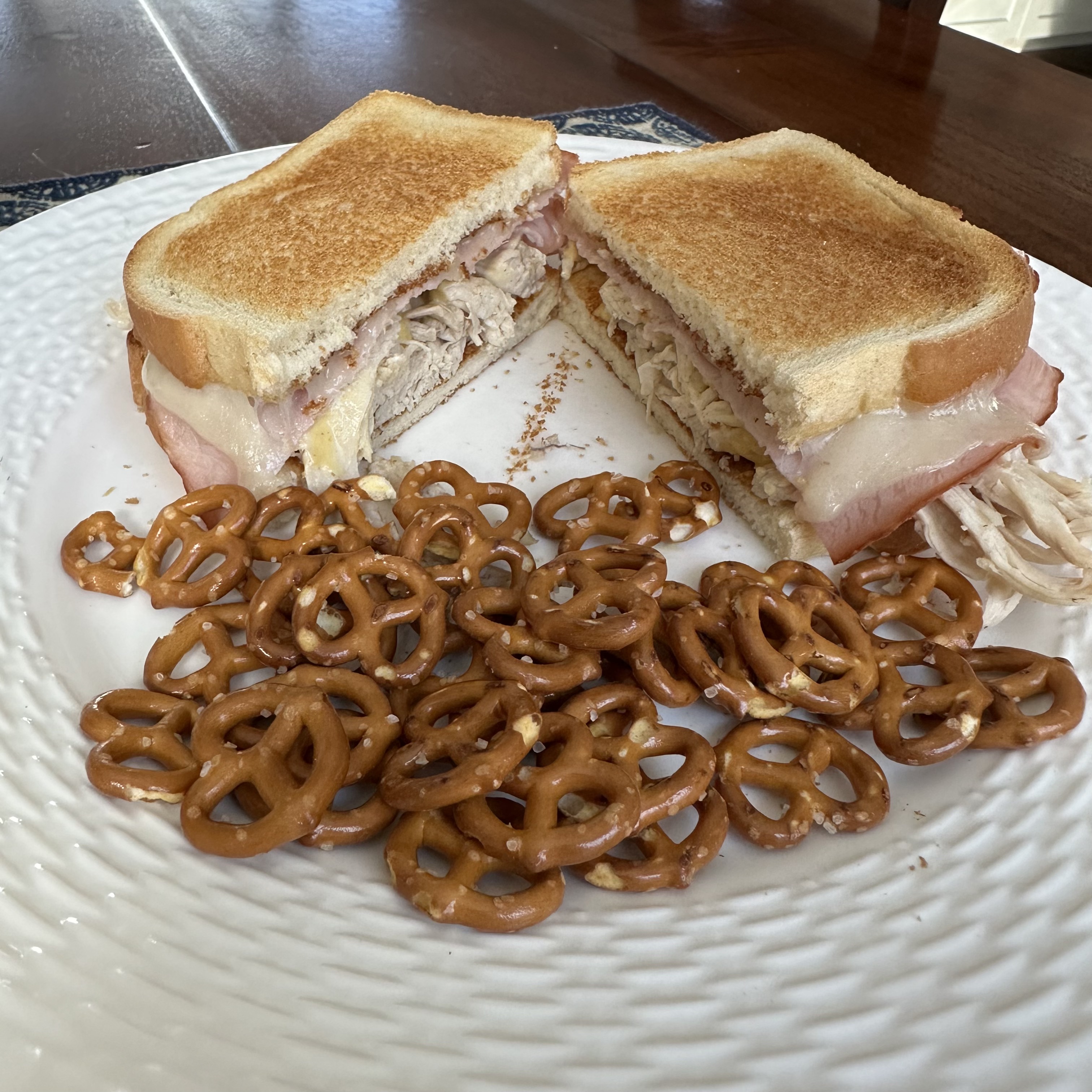 I had some chicken I needed to cook, so I made boiled chicken and broth. After I shredded the chicken, I made a chicken cordon bleu sandwich with some mini pretzels.