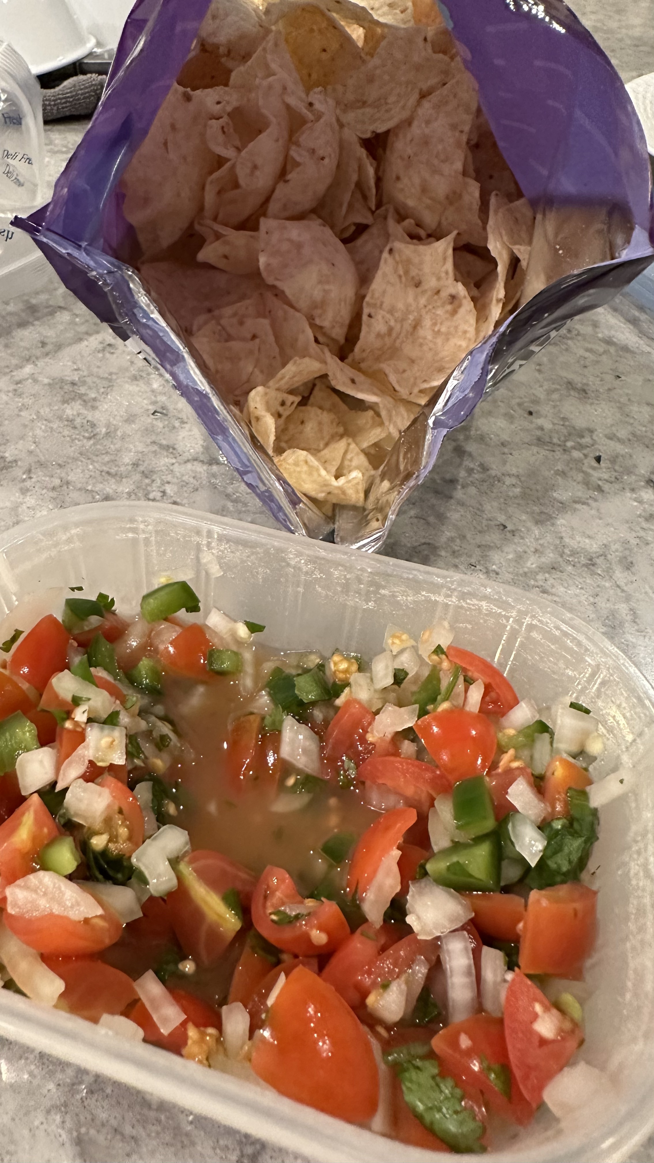 I almost made it through a week without eating at DeNo’s. But alas, it was not to be. I had a steak and cheese with peppers, onions, and extra cheese for lunch along with potato chips.
