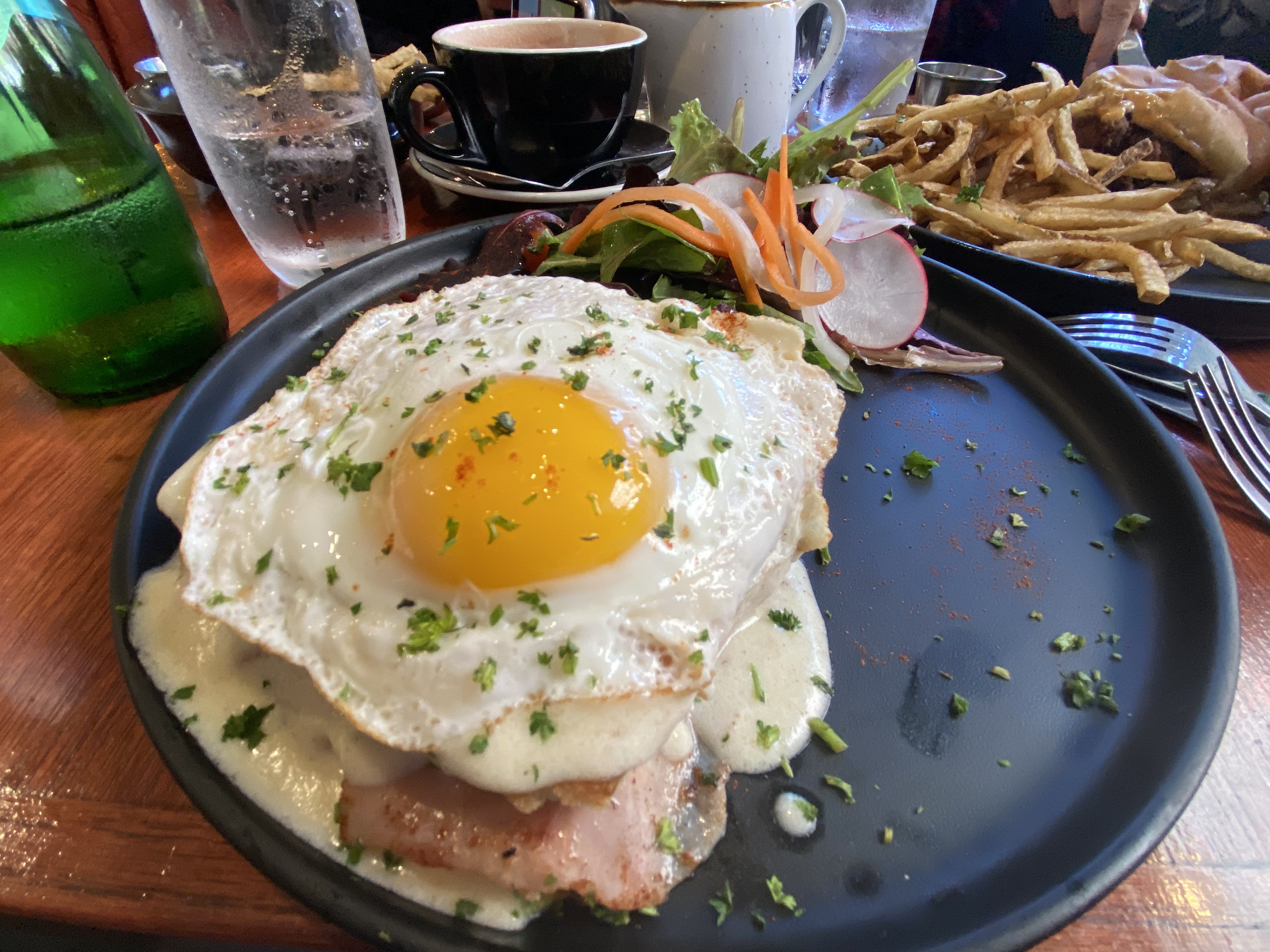The menu is eclectic but French. I am usually there for that hectic brunch, though the dinner menu is calling me too. I particularly love the croque madame with a beautiful egg and decadent mornay sauce. Also amazing was the duck eggs benedict. Instead of an english muffin, they use hashbrowns (think McDonalds style) and top them with duck confit, two poached eggs, hollandaise, and arugula.
