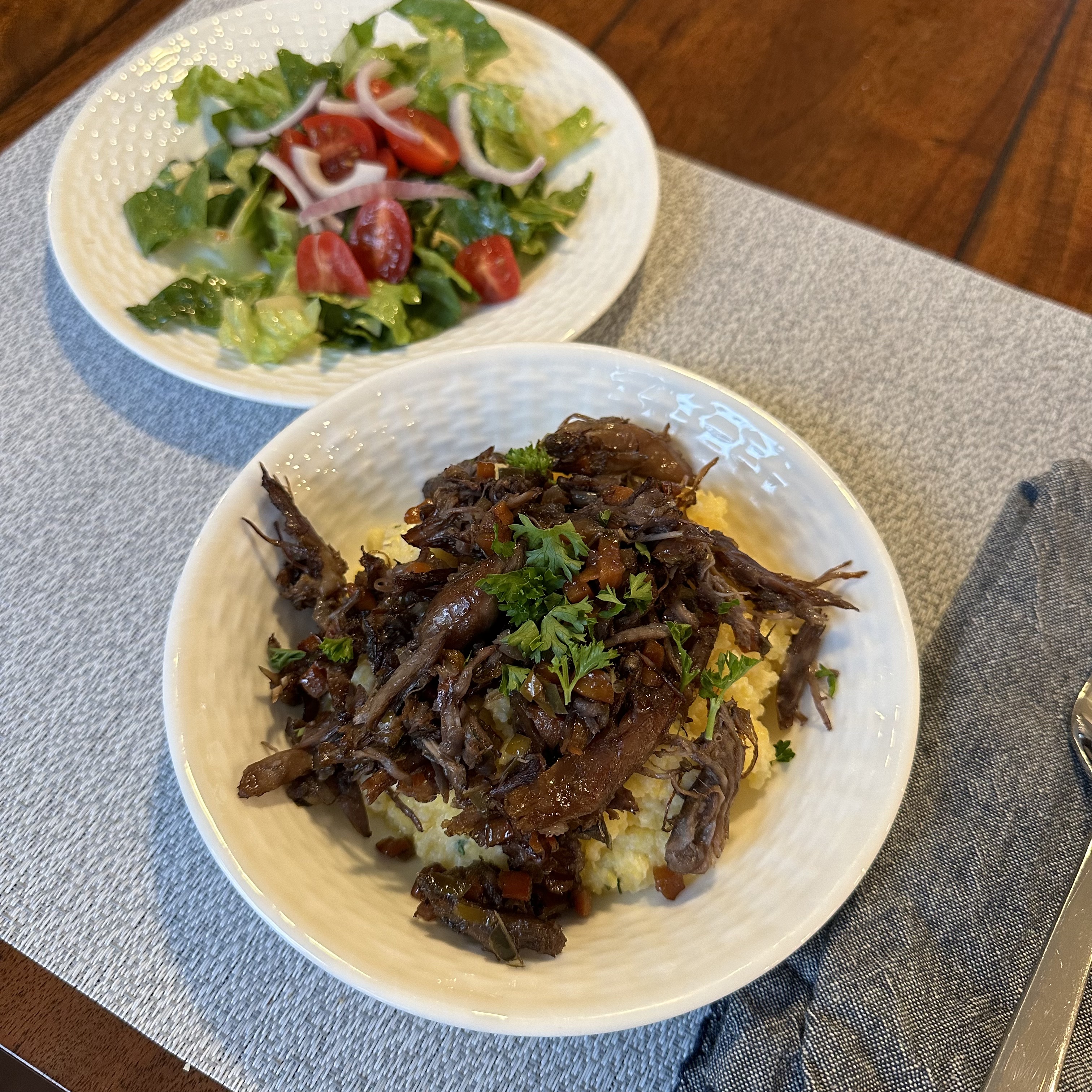 Lunch was a roast beef sandwich with swiss cheese and a piece of lettuce. I don’t know why, but a piece of lettuce really makes a difference. I finished off the rest of my salt and vinegar Pringles too. For dinner I made polenta. I tried it this time with half water and half milk. It turned out really well. I will write up the recipe soon. (I hope.) I seasoned it with thyme and parmesan cheese. Over it I spooned the rest of the duck confit ragu from Friday night. We also finished the last small piece of blueberry poundcake for dessert.