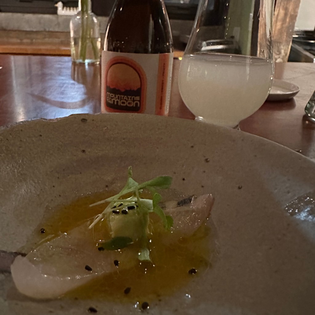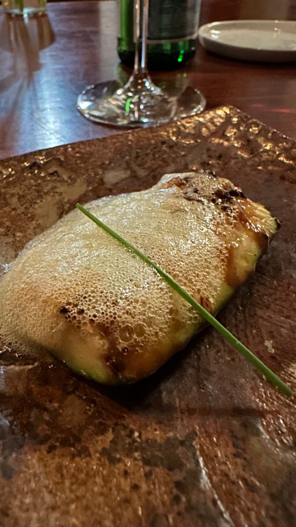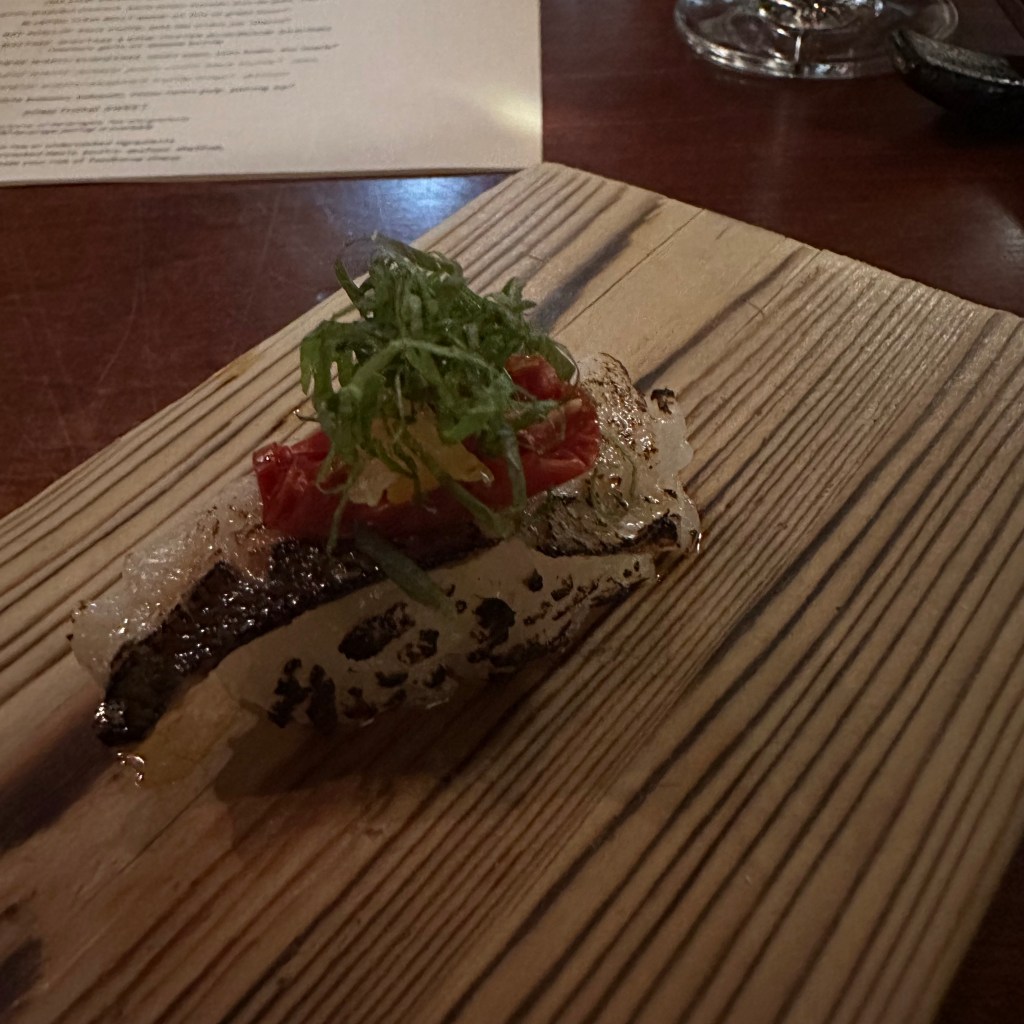 4. kamasu wild japanese barracuda, yuzu truffle, dried tomato, shiso – I had never knowingly had barracuda so I was glad to try something different.