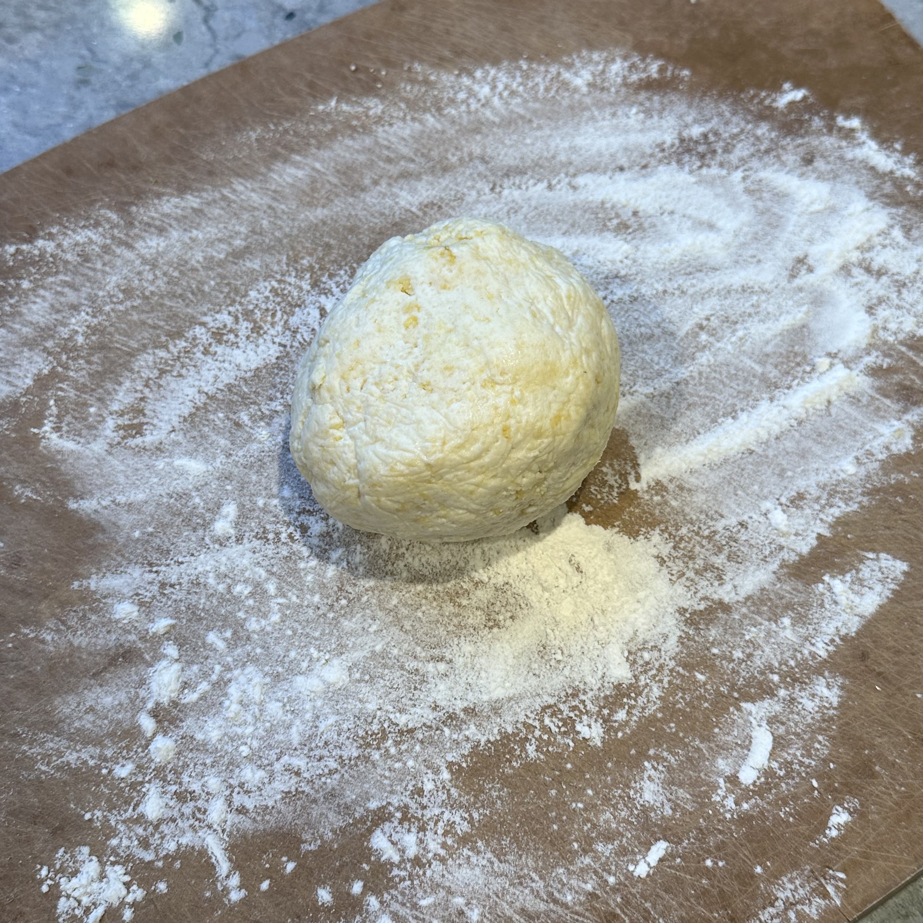 I call this recipe 4-3-2-1 gnocchi to help me remember the ingredients. You just use 1/4 cup parmesan, 1/3 cup flour, 1/2 cup ricotta, and 1 egg yolk. The only other ingredient I add is a pinch of salt. Before adding the ricotta, squeeze it in a paper towel to remove excess moisture. Combine all the ingredients in a mixing bowl using your hands just until it all comes together. Form into a ball, and then you can refrigerate the dough until later, or begin making the pillows.