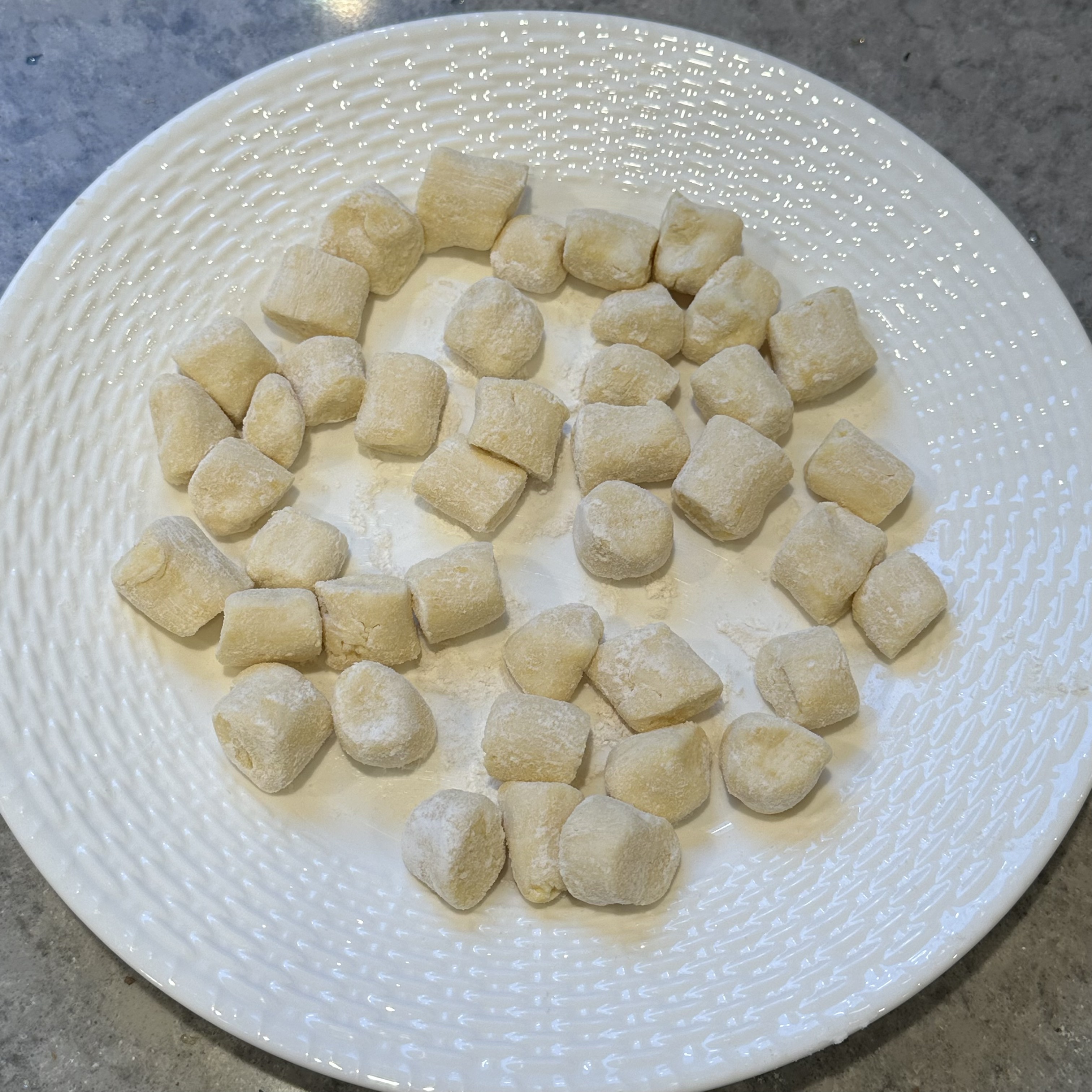 When you are ready to cook, flatten the ball into a disk about an inch to an inch and half thick. Then cut the disk into four quarters. Roll each piece out into a snake and cut the snake into about 3/4 inch pillows. Dust them with flour to keep them from sticking to each other as you roll and cut the remaining quarters.