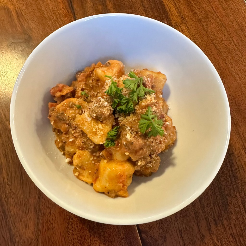 Meanwhile, bring a large pot of salted water to a boil. Add the pillows and cook for about two minutes or until they all float. I have tried three different sauces with this recipe, including the duck confit ragu and a pink bolognese, but you can also just toss it in a pan with brown butter and sage. If you have a sauce ready to go, you can make this delicious dinner in just a couple of minutes longer than it takes to boil water. The best thing about this recipe is that it makes just enough for a weekday dinner for two. But you might like it so much that you want to double or triple it and have a party!