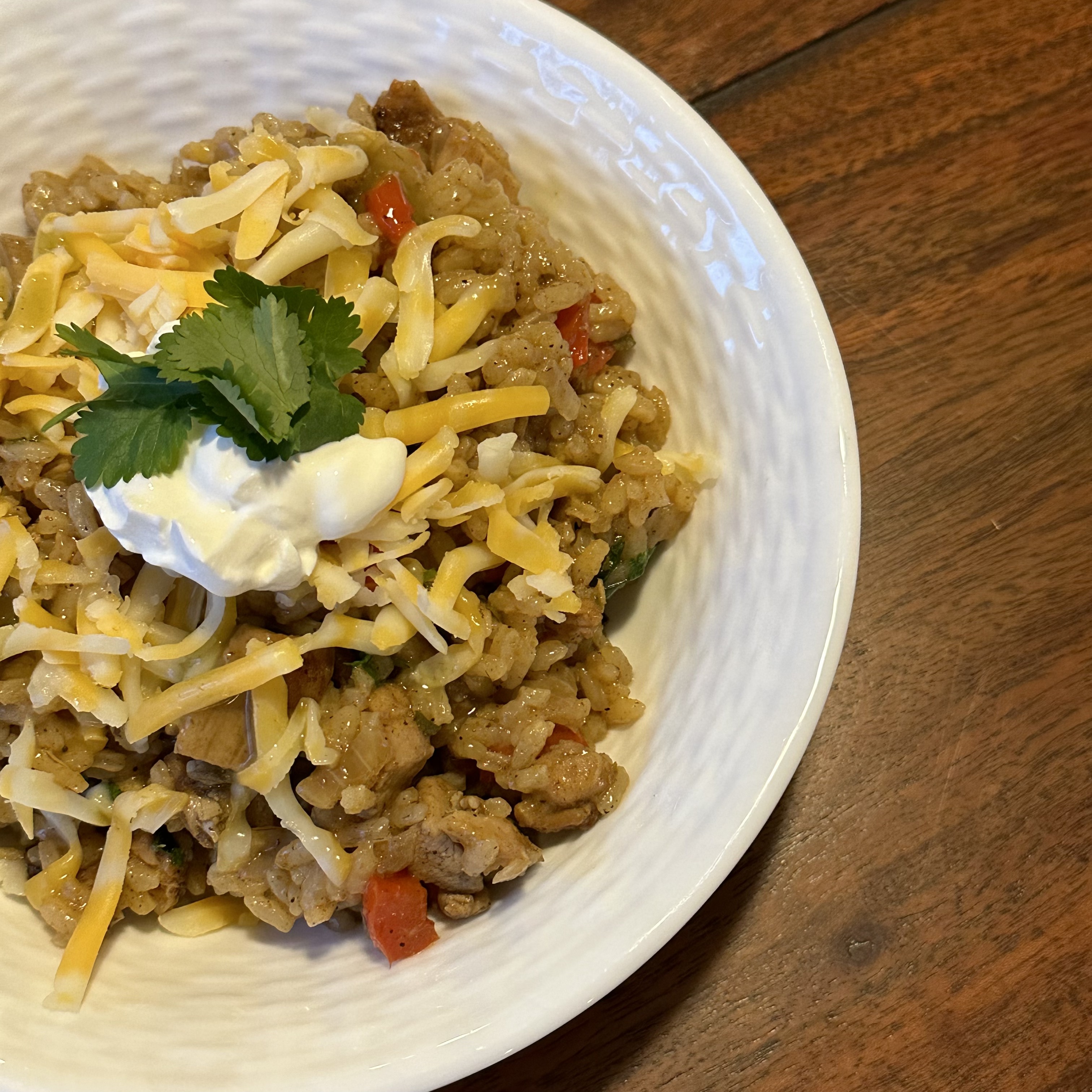 For dinner I made one-pot chicken and rice. I seasoned with cumin, dark chili powder, and Mexican oregano. It was pretty healthy until I added cheese and sour cream, but I didn’t overdo it.