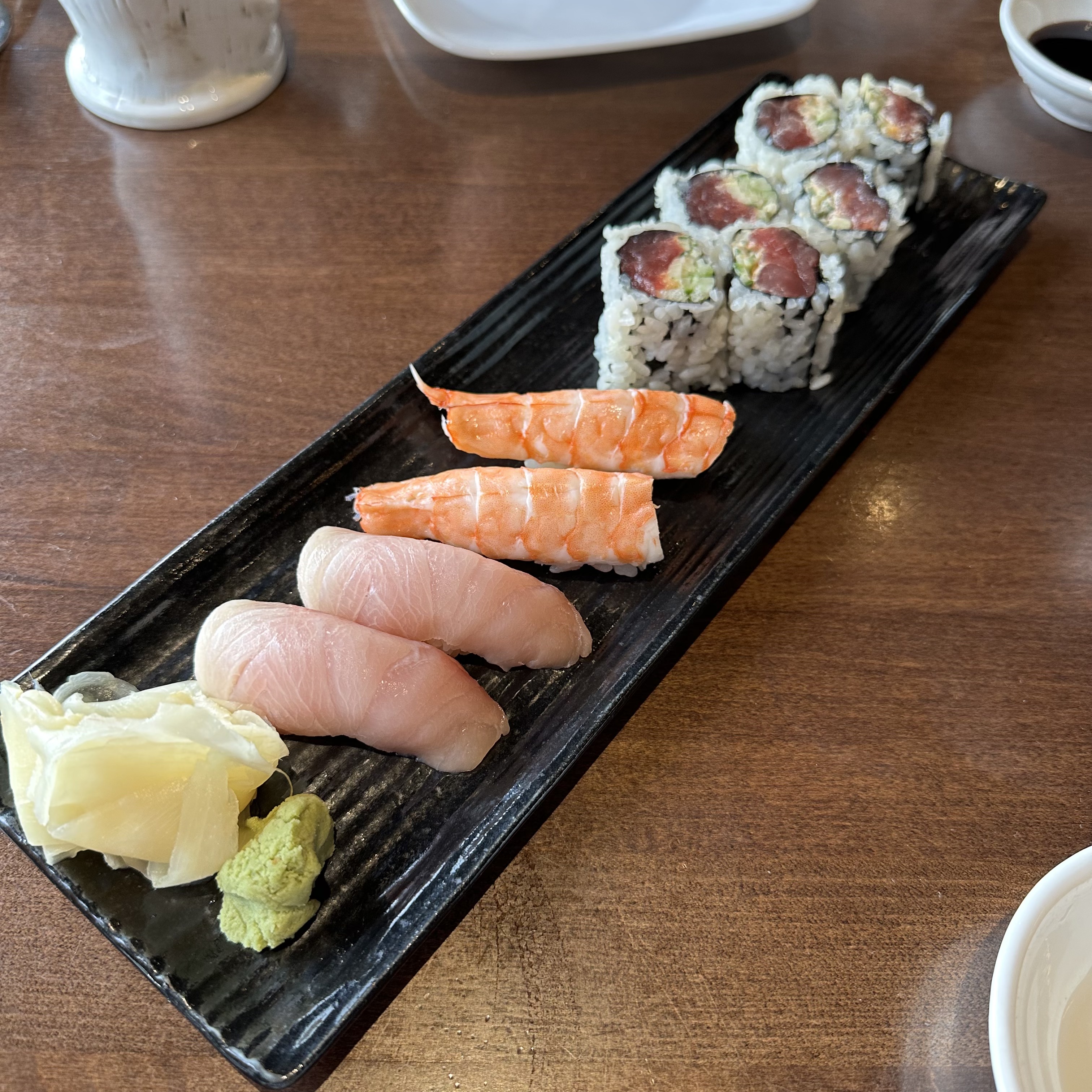 During the day, I had a cheese plate for lunch at work. I had the rest of the challarhocker from Easter, salami, peanuts, pretzels, and pickled onions. For my planned dinner, Kelly, Thomas, and I went to Karma. We got salt and pepper chicken wings, which was amazing, and a little sushi.