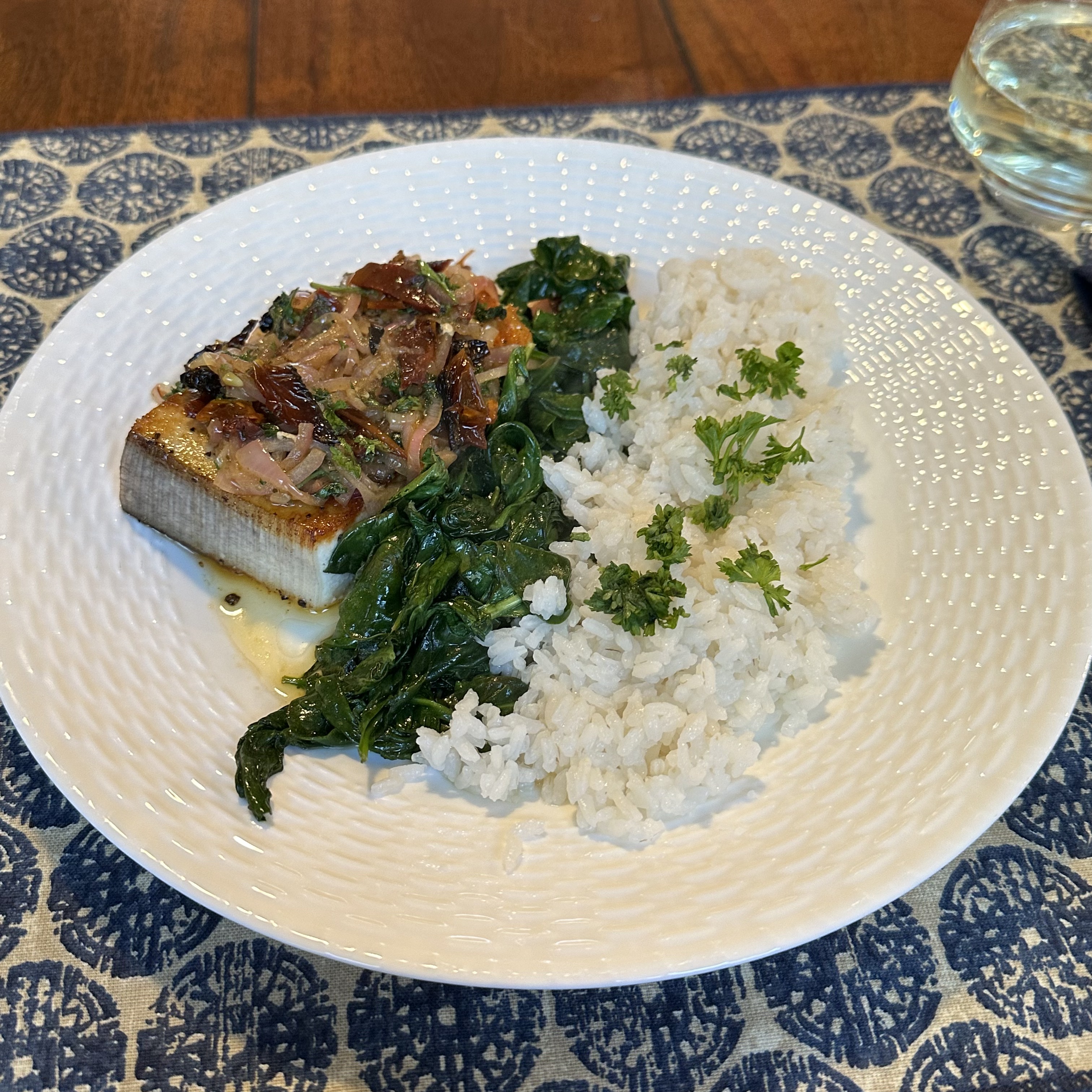 I’m still trying to figure out what is wrong with my car so I kept it simple during the day. I had a bowl of Frosted Flakes for breakfast and some peanuts and pretzels as a snack. For dinner I made swordfish topped with sautéed shallots and sun-dried tomatoes. (I think at this point “sundried” should be a word.) I served it with spinach and rice. I skipped dessert tonight in favor of a glass of Sauvignon Blanc with dinner.